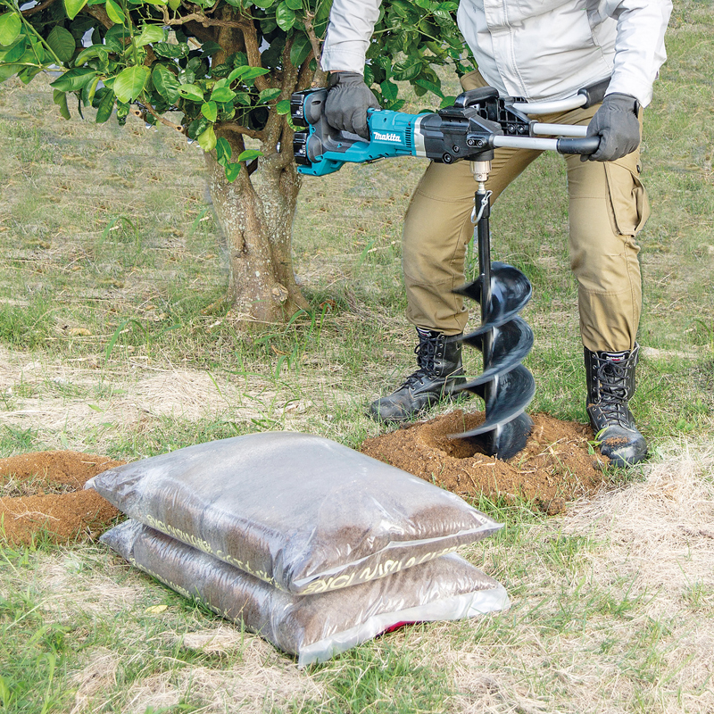 Erdbohrer werden vielfältig eingesetzt: um Löcher für Pflanzhilfen, Schilder, Zaunpfähle, Verankerungen für Spielgeräte, Fundamente oder Entwässerungsschächte zu bohren. Zudem werden damit beim Setzen von Jungpflanzen Pflanzlöcher erstellt. Gegenüber bislang verfügbaren Erdbohrern mit Verbrennungsmotor und Elektroantrieb lässt sich der Akku-Erdbohrer DDG460 von Makita geräusch- und vibrationsarm und kabellos betreiben. Dies ermöglicht den Einsatz auch im geräuschsensiblen Umfeld.