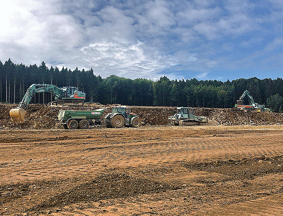 In Heidenheim an der Brenz (Baden-Württemberg) entsteht auf einem 13,5 ha großen Areal eine Logistikhalle mit einer Fläche von mehr als 50 000 m2. Seit August sind die Erdbauprofis von Max Wild aus Berkheim an der Iller am Werk. Allein die Ab- und Auftragsmenge beträgt 300 000 m³. Im Leistungsumfang befinden sich zudem Kanal- und Außenanlagenarbeiten, im Rahmen derer circa 4,5 km Kanalrohre verlegt werden. Die Zusammensetzung des Baugrundbodens stellt eine besondere Herausforderung dar. Da dieser aus Felsen und Lehm besteht, müssen spezielle Techniken und Verfahren zum Abtragen eingesetzt werden. Um das Mammutprojekt optimal zu meistern, sind deshalb drei Kolonnen mit insgesamt 25 Mitarbeitern im Einsatz. t