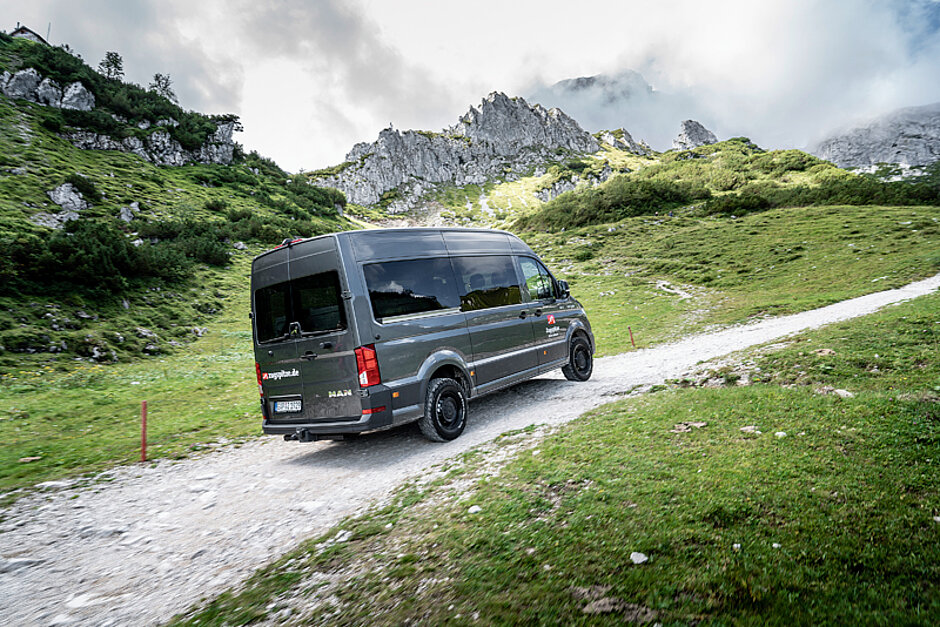 Der TGE 4x4 schafft dank seines Allradsystems die Forst- und Wanderwege auch im extrem rauen und steilen Gelände des Wettersteingebirges problemlos. Das Besondere des smarten Allrads von MAN: Bei Traktionsdefiziten reagiert die Steuerung automatisch und schaltet binnen 0,084 Sekunden den Heckantrieb hinzu. Dadurch kann der Antriebsdrehmoment stufenlos zwischen Vorder- und Hinterachse verteilt werden – von 100 % bis 0 % und umgekehrt. Möglich macht dies die schnelle Reaktionsfähigkeit der Kupplung, die der Antriebsdrehmoment automatisch zwischen Vorder- und Hinterachse verteilt. Die Kupplung selbst ist eine elektronisch gesteuerte Lamellenkupplung, deren Lamellen in einem Ölbad laufen. Dabei werden die Lamellen bedarfsabhängig axial zusammengeführt. Auf diese Weise garantiert das System durchgehend beste Traktion, egal ob bei nassen oder schneebedeckten Wegen.