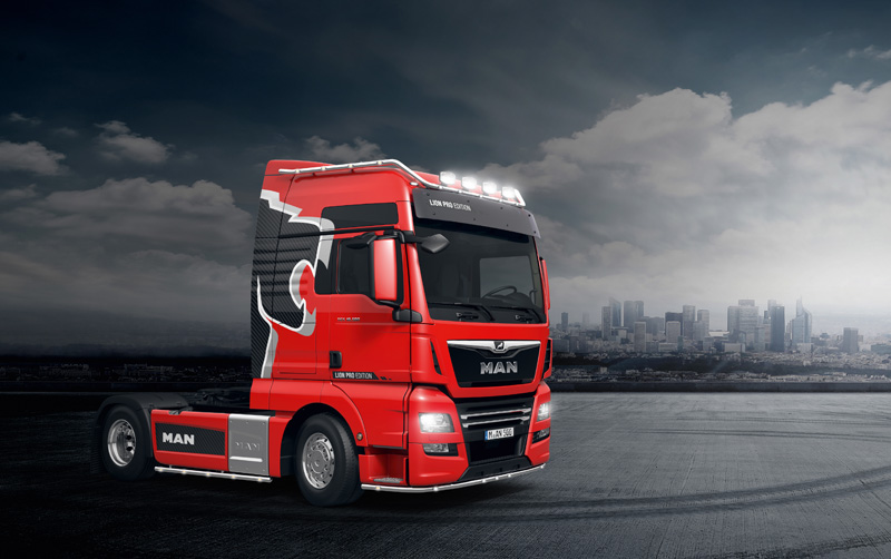 Mit der limitierten Sonderedition MAN TGX LION PRO kombiniert MAN gezielt Performance mit Emotionen. Optionale Style- und Komfortpakete lassen keinen Wunsch offen, wenn es darum geht, individuelle Fahrerwünsche zu erfüllen. Das Exterieur ist geprägt vom MAN Löwen in Carbonoptik und glänzenden Chromapplikationen im Kühlerbereich. Die Xenon-Hauptscheinwerfer gehören bereits zum Basispaket.