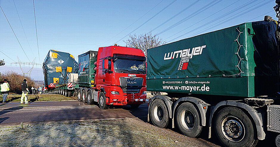 Im Konvoi galt es eine Rohrschweißanlage vom saarländischen Lebach zur Schiffsverladung in den Hafen von Saarlouis zu transportieren. Das mit der Durchführung beauftragte Unternehmen W. Mayer aus Zweibrücken setzte dafür insgesamt fünf MAN-Schwerlastzugmaschinen ein. Neben den eigenen TGX 41.680 mit V8 musste sich das Vorführfahrzeug mit seinem 640 PS starken D38-Motor im Zugschubverband als Führungsfahrzeug beweisen. Zusammen mit einem ebenfalls 640 PS starken »Schieber« aus der Vorgänger-Generation stand ein 20-achsiger Pendelachstieflader mit einem 233 t schweren Anlagenteil auf dem Programm. Bei über 7,3 m Höhe und 5,3 m Breite kam der Zugschubverband auf 51,4 m Länge und eine Gesamtmasse von 374 t.