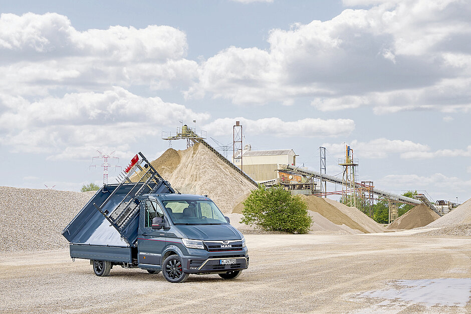 Auch der »Trigenius« von Meiller besitzt innovative Eigenschaften. Er ist ein robuster, gewichtsoptimierter Drei-Seiten- Kipper aus Hardox-Stahl mit hoher Nutzlast. Letztere wird u.a. durch die Laserschweißtechnik erreicht, die dünne hochfeste Stähle verbindet. In Kombination mit einem »MAN TGE« mit 3,5-t zGG kann der Kunde bis zu 951 kg zuladen. Bei einem 5,5-t-«TGE« sind es bis zu 2,6 t. Neu beim »Trigenius« sind darüber hinaus die 1-t-Zurrösen an den Bordwänden zum Verzurren von über die Bordwand hinausragenden Gütern sowie die Boden-Zurrösen mit 2 t Haltekraft, die weit außen positioniert und von außen und innen zugänglich sind. Auch die Bordwandverschlüsse, Aufstiege und Kotflügel hat Meiller überarbeitet.