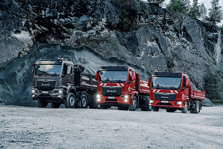 Mit TGL (7,5 t bis 12 t zulässiges Gesamtgewicht), TGM (12 t bis 26 t), TGS (18 t bis 51 t) und TGX (18 t bis 41 t) in den Bauhöhen normal, mittel und hoch (Allrad) kann MAN für alle Anwendungen im leichten, mittelschweren und schweren Baueinsatz mit einem passenden Lkw aufwarten. Für die vier Reihen gibt es zudem verschieden große Kabinentypen. Im Angebot sind die schmalen Kurzfahrerhäuser CC für TGL und TGM sowie NN für den TGS im Tageseinsatz, aber auch die langen FN- und FM-Kabinen für längere Touren. Noch mehr Platz bieten die breiten GN-, GM- und GX-Fahrerhäuser des TGX. Für die Beförderung von bis zu sieben Personen zur Baustelle ist für TGL und TGM zudem das Doppelkabinenfahrerhaus DN erhältlich.