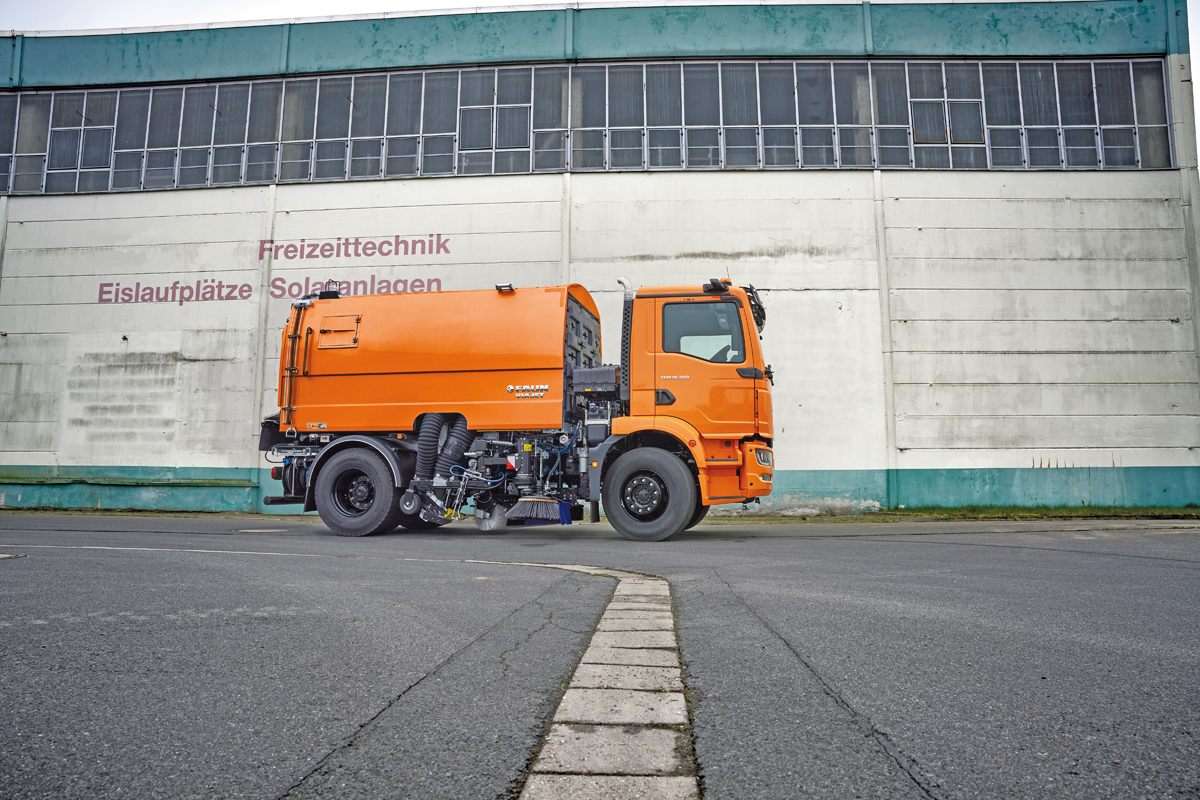 Je nach Fahrgestellausführung und Aufbau kommen die Aggregate in ein Traggestell hinter das Fahrerhaus. Des Weiteren hebt MAN Individual das Fahr-Niveau um 30 mm an, um unter dem Rahmen mehr Bodenfreiheit für die Kehreinrichtungen zu erreichen. t