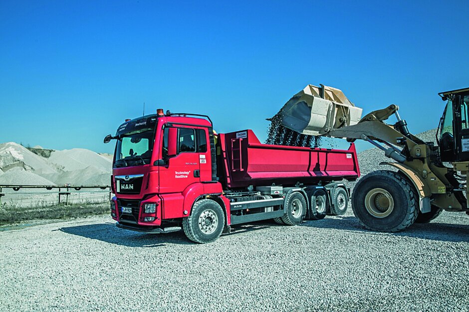 Von denselben Maßnahmen der Nutzlastoptimierung sollen die Unternehmer profitieren, die drei- oder vierachsige Kipper der MAN-Baureihe TGS einsetzen. Auch hier ergibt sich durch den neuen D15-Motor und die Wahl des leichten Hypoidachstandems eine Gewichtsminderung um circa 410 kg.