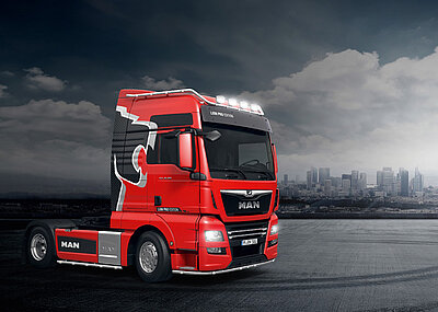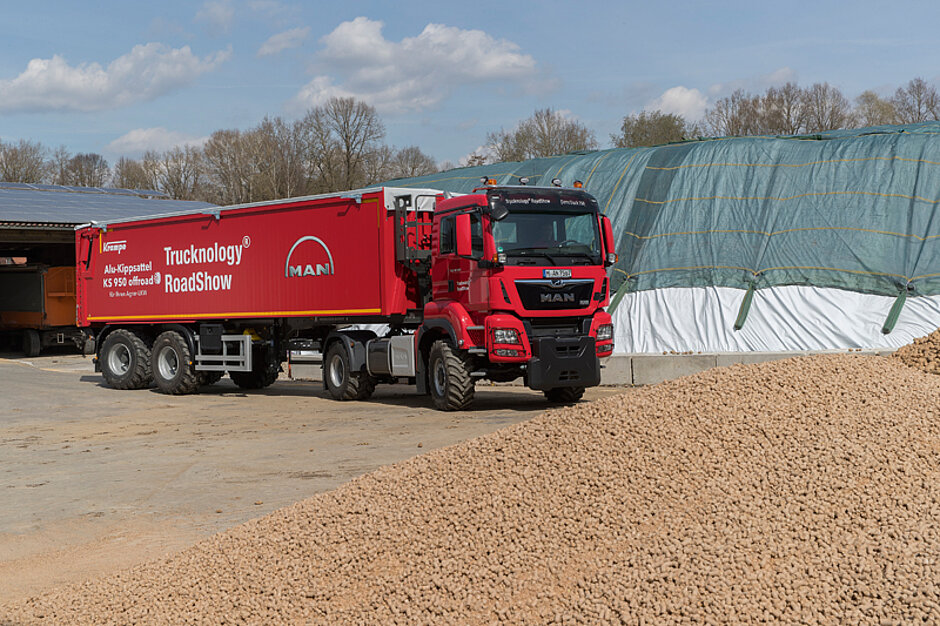 Die 500 PS starke TGS-Allradzugmaschine wartet mit einer branchengerechten Konfiguration auf: LOF-Zulassung als land- und forstwirtschaftliche Zugmaschine, Load-Sense-Hydraulikanlage am schwungradseitigen Nebenabtrieb, verschiedene Anhängekupplungen sowie breite bodenschonende Bereifung im Format 445/65R22,5 vorne und 600/50R22,5 hinten. Der Konzeptvorteil der MAN-Agrarsattelzugmaschine liegt im kombinierten Straßen- und Feldeinsatz sowie in der Ganzjahresnutzung. Ist die Feldbestellung abgeschlossen, lässt sich der MAN mit Tausch des Aufliegers und Umbereifung im Bautransport und im Winter als Schneepflugfahrzeug einsetzen.