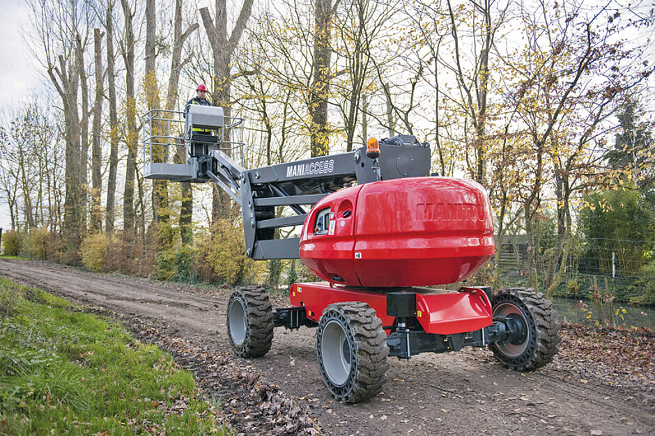 Ausgestattet mit permanentem Allradantrieb, Vollgummirädern und Pendelachse sowie einer Arbeitshöhe von 16 m überwindet die Hochleistungsbühne von Manitou so manches Hindernis. Mit einem Schwenkbereich von 350° und einer seitlichen Reichweite von fast 10 m in einer Arbeitshöhe von 9 m erreicht der Korb die Äste. Weil das Modell ohne Abstützvorrichtung klar kommt, lässt es sich flott von einem Objekt zum anderen fahren.