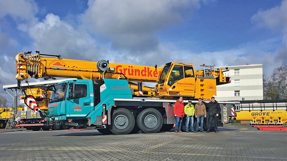 August Gründker, Glandorfer Bauunternehmen mit Autokranvermietung, hat mit einem GMK4090 seinen ersten Grove-Mobilkran übernommen. Auf der letzten Bauma hatte der kompakte Vierachser mit seinem 51 m langen Hauptausleger und maximaler Tragfähigkeit von 90 t das Team von Gründker aus Niedersachsen überzeugt. Um den Fuhrpark des Unternehmens zu erweitern, wurde der nur 2,55 m breite Grove-Taxi-Kran angeschafft. »Wir haben uns mehrere Kranmodelle angesehen und uns die Entscheidung nicht leicht gemacht«, sagt Ulrich Hengelsheide, Leiter des Gründker-Lagerbüros. »Neben den Produktvorteilen des GMK4090 hat uns die kompetente Beratung bei der Vorführung des Krans im Manitowoc-Werk in Wilhelmshaven beeindruckt, ebenso wie die Leidenschaft, mit der die Mitarbeiter ihre Produkte fertigen«, unterstreicht Burkhard Budke als Technischer Leiter. t