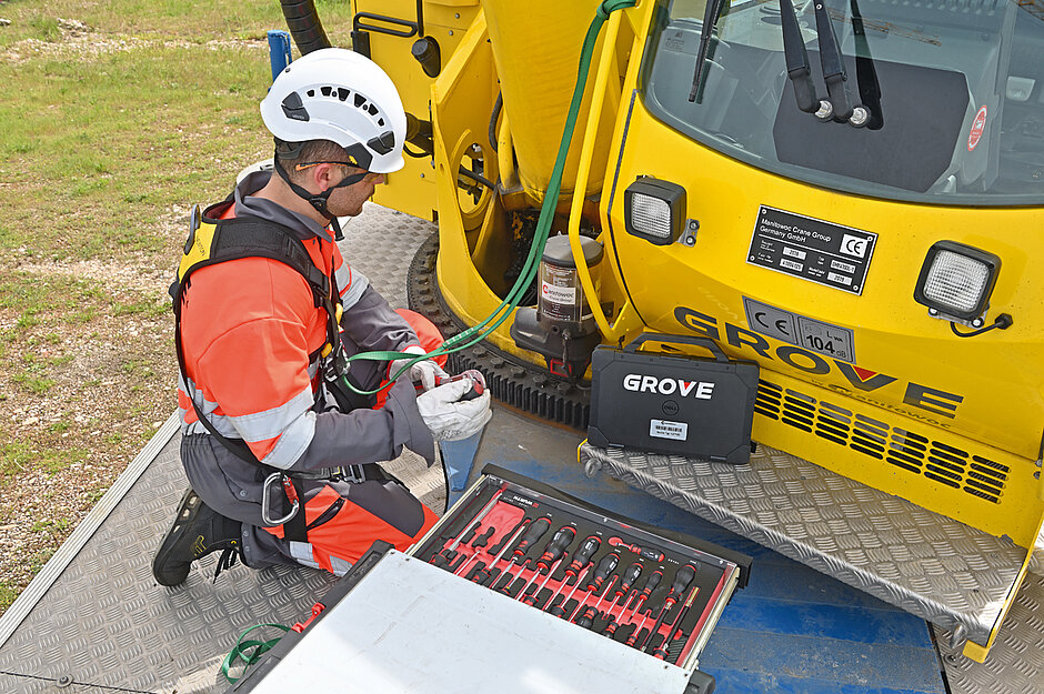 Grove wird zwei neue Aftersales-Produkte vorstellen, die eine effiziente Verbesserung der Langlebigkeit der Komponenten herausstellen. Dabei handelt es sich einerseits um ein neues Auslegerschmiersystem, das durch ein korrekt dosiertes und regelmäßiges Schmieren die Lebensdauer des Krans verlängern soll. Das System besteht aus einer Fettpresse, einem 6,5 m langen Hochdruckschlauch, einer Auslegerschmierpumpe und 25 kg des Schmierfetts »Boom Grease Plus«. Die variable Druckeinstellung dosiert das Schmierfett/Luft-Gemisch, während die Sprühlanze mit großer Reichweite den Zugang zu den Schmierbohrungen für die Innenschmierung des Auslegers erleichtert.