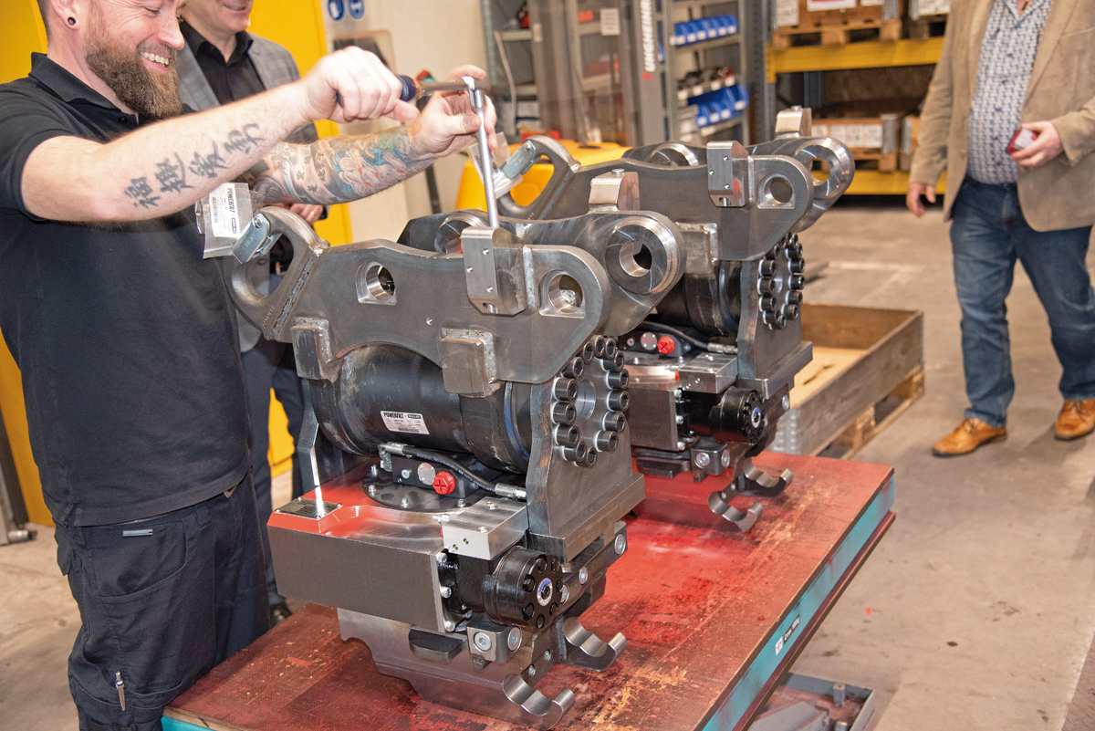 Und das zeigt mal wieder, dass ›sicher‹ nicht unbedingt kompliziert sein muss«, wie der erfahrene Branchenkenner und Martin-Vertriebler Manfred Schiegg hinzufügte. Die Schnellwechsler der MQ-Baureihe sind Produkte der Martin Dedicated Systems Familie, werden mit Gabelholmen aus Hardox-Stahl gefertigt und verfügen über ein hydraulisches Zwei-Wege-System mit permanenter Vorspannung und sind absolut spiel- und verschleißfrei. Die insgesamt fünf Hydraulikleitungen sind gleichzeitig und automatisch kuppelbar, wodurch das Arbeiten für den Maschinisten erheblich erleichtert wird – die Hydraulikdrücke liegen hier im Übrigen bei bis zu 350 bar. Grundsätzlich sei gesagt, dass der Anwender beim Wechsel seiner Anbaugeräte viel Zeit spart. Während der MQ03 eine Durchflussmenge von 3 x 45 l/min; 2 x 90 l/min erreicht, liegt der MQ18 bei Spitzenleistungen von 3 x 90 l/min; 2 x 200 l/min. Im Portfolio hat Martin seine MQ-Modelle letztlich auch mit Drehantrieb (MQPTS) sowie mit Tiltrotator, wodurch der Hersteller eine große Bandbreite an Einsatzmöglichkeiten abdecken kann. Ebenso bietet Martin auch rein mechanische (MA) sowie hydraulische (MH) Schnellwechsler an. Sowohl die mechanischen als auch hydraulischen Varianten lassen sich mit Drehantrieb (MAPTS) ausstatten.