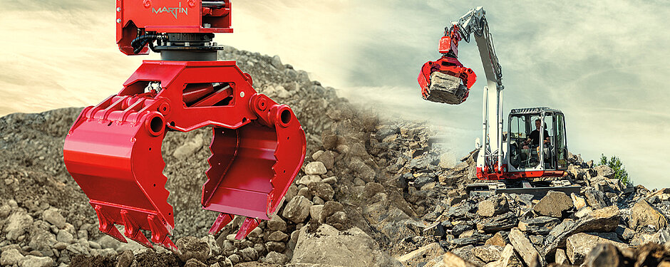 Das umfangreiche Sortiment rotierender Anbautechnik von MARTIN umfasst verschiedene Löffel, Grabraumlöffel, Greifer und Planierbalken, die alle mit den mechanischen sowie hydraulischen Schnellwechselsystemen kombiniert werden können.