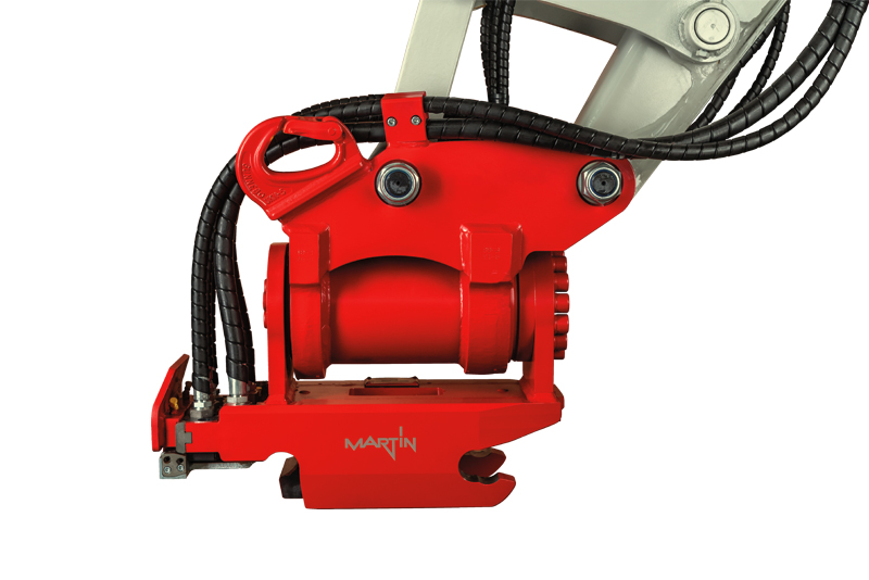 Durch die Trennung von Powertilt und rotierender Funktion komme es, so betonen die MARTIN-Entwickler, zu keinerlei Einschränkungen. Vor allem der Schwenkbereich des Tilt-Systems werde nicht reduziert – bei der Lösung der Vorarlberger stehen demnach immer ± 90° zur Verfügung. Das M-Quick-System sichert bei jedem Anbaugerät ebenso eine maximale Öldurchflussmenge ohne Einschränkung zu. Gerade beim Betrieb eines Hydraulikhammers gilt dies als ein wesentlicher Punkt.