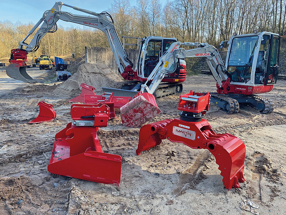 Das MQ10-System punktet überdies mit der Ölmenge auf der Hammerleitung: Über diesen Ölkreis lasssen sich Spitzenleistungen von bis zu 148 l bei 300 bar abdecken. Und genau das spielt in der heutigen Zeit eine tragende Rolle. Der Bagger hat sich innerhalb der Branche zum Multifunktions-Geräteträger weiterentwickelt, weshalb die Ölmenge ohne Staudruck im Schnellwechselsystem oftmals eine entscheidende Rolle spielt. Und auch der zweite Kompaktbagger, ein TB 230, wurde zusätzlich ausgerüstet. Hier stellte Martin den vollhydraulischen Schnellwechsler MQ03D samt Powertilt zur Verfügung. Ausgelegt ist dieses System auf Bagger mit 1,8 t bis 4 t Einsatzgewicht. Auch hier zeigen sich identischen Vorzüge wie bei der MQ10-Variante.