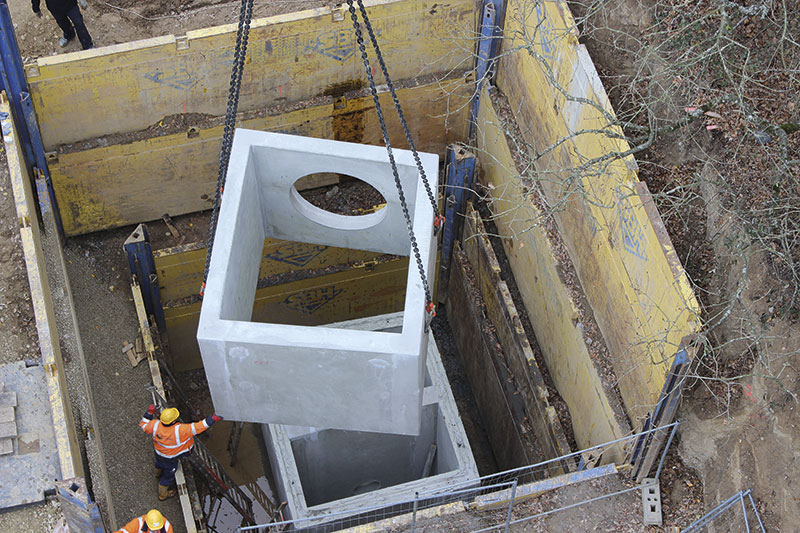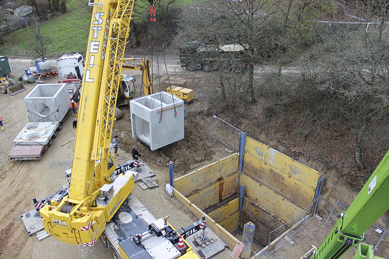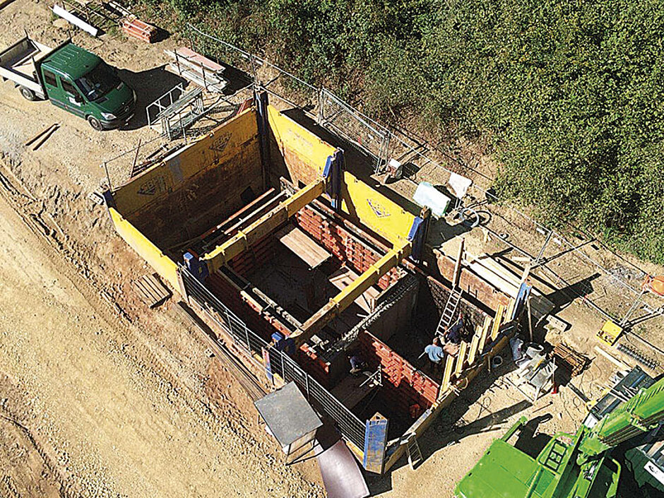 Speziell die Bauwerke »Regenüberlaufbauwerk« und »Absturzbauwerk« stellten verbautechnische Herausforderungen:- Einerseits das Regenüberlaufbauwerk mit seinen Bauwerksdimensionen von ca. 12,5 m x 7,2 m und dem Wunsch des Bauunternehmens L. Elenz, die Zahl der bauwerksquerenden Rollenschlitten (Aussteifungen) zum einfacheren Erstellen des Ortbauwerkes zu minimieren.