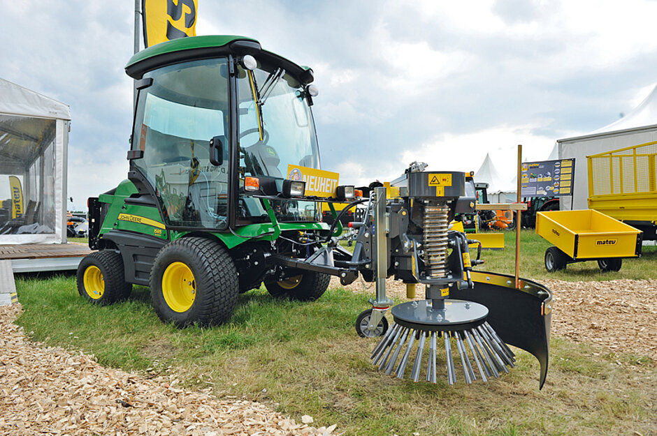 Um den Funktionsumfang des Frontsichelmähers F1500 der Marke John Deere zu erweitern, hat Matev eine Anbaumöglichkeit für die erst im letzten Jahr vorgestellte Wildkrautbürste WRM-M 145 entwickelt (das bauMAGAZIN berichtete in Heft 9/18, Seite 102). Das Gerät mit mechanischem Riemenantrieb entfernt Wildkraut sowie hartnäckige Verschmutzungen auf Gehwegen und anderen befestigten Flächen ohne den Einsatz von Chemikalien. Je nach Untergrund und Bewuchs gibt es den 700-mm-Tellerbesen mit wechselbaren Besätzen. Gewählt werden kann zwischen Flachdrahtbesatz, der zum Beispiel an Bordsteinkanten angeraten ist, und kunststoffummanteltem Zopfbesatz, der aggressiv und dadurch auch bei starkem Unkrautbewuchs geeignet ist.