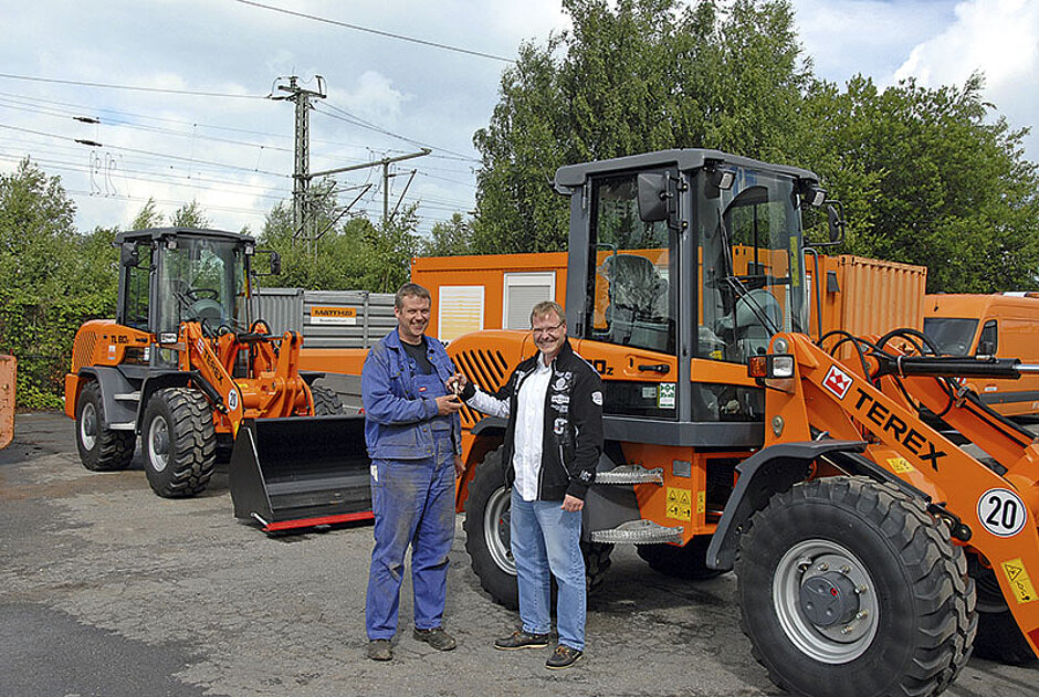 In den letzten zehn Jahren hat Matthäi über 500 Terex-Radlader erhalten, die von den über 30 Standorten in Nordrhein-Westfalen, Bremen, Hamburg, Niedersachsen, Berlin, Brandenburg, Mecklenburg-Vorpommern, Sachsen und Sachsen-Anhalt in den Einsatz geschickt werden. Kürzlich wurden wieder neue Terex-Radlader TL80 und TL100 in der Niederlassung Bremen in Empfang genommen. Disponent Thorsten Wittebrock ist Herr über rund 60 Baumaschinen, von Straßenfertigern über Zwei-Wege-Bagger bis hin zu den 16 Terex-Radladern am Standort Bremen. Sehr zufrieden sind Wittebrock und Werkstattleiter Wilhelm Bohlken mit den Geräten: »Die Qualität stimmt und die Radlader sind gut zu warten und sehr servicefreundlich.« Eine wichtige Voraussetzung für die 5000 Einsatzstunden in vier Jahren, die ein Terex-Radlader bei Matthäi leistet. Die Radlader werden stark beansprucht, eingesetzt im schweren Erdbau oder aber auch nur als »Schubkarre«, wie das Werkstattteam es beschreibt. Dabei werden die Radlader nicht immer nur von einem Fahrer genutzt, sondern auch weitergereicht – eine verschleißintensive Nutzung einer Baumaschine. »Deshalb kümmern wir uns in der Werkstatt intensiv um die Wartung und Pflege«, sagt Wilhelm Bohlken.