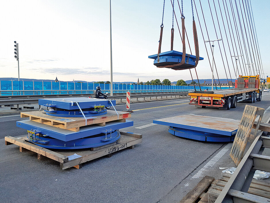 Bei derartigen Schwergewichten ist Ideenreichtum gefragt: »Allein das Handling ist bei Lagern in dieser Größenordnung bei beengten Platzverhältnissen auf der Brücke eine Herausforderung«, betont Michael Ohnheiser von Maurer. Theoretisch hätten auch kleinere Lager ausgereicht, um die enormen Lasten aufzunehmen, aber die Lagergröße musste an die Bestandssituation angepasst werden. Die 1978 errichtete Raiffeisenbrücke ist Teil der Bundesstraße B 256. Täglich fahren rund 46 000 Fahrzeuge über die Rheinbrücke. Die 485 m lange, dreifeldrige Schrägseilbrücke hat Einzelstützweiten von 235 m, 38 m und 212 m und eine Gesamtbreite von 35,5 m.
