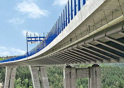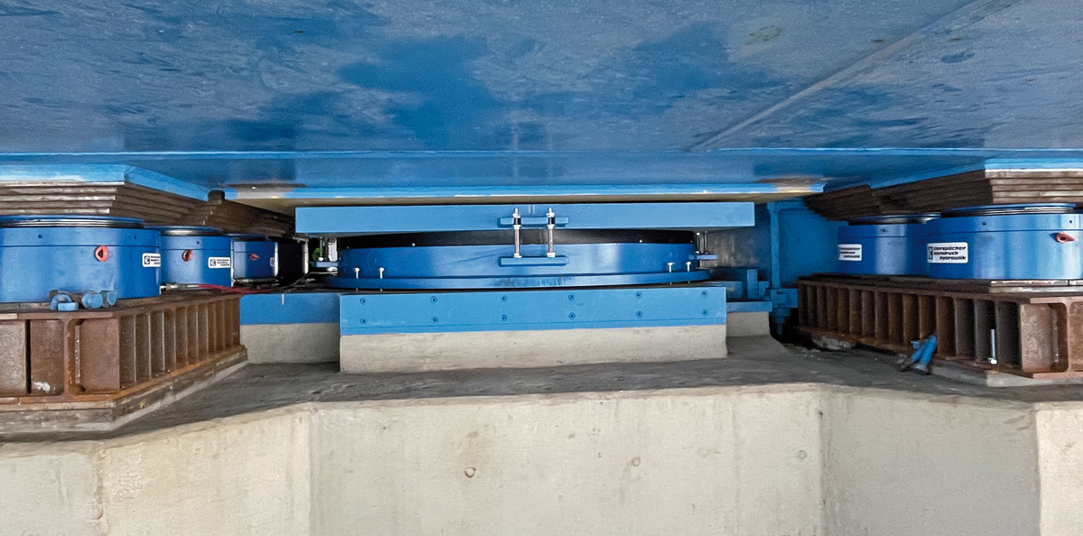 Die acht neuen Kalottenlager sind allseits beweglich und mit dem Hochleistungsgleitwerkstoff MSM ausgestattet. Auf jedem Pylonpfeiler liegen je vier Lager. Die beiden größeren, innen liegenden Lager wiegen ca. 13 t, haben einen Durchmesser von 2,4 m und übertragen vertikale Kräfte von bis zu 120 MN. »Lager in der Größe haben wir in Deutschland nicht allzu oft«, weiß Ohnheiser. Die beiden kleineren Lager liegen jeweils außen. Sie haben immerhin noch einen Durchmesser von 1,6 m, wiegen 4 t und nehmen ca. 48 MN auf. Ausgetauscht wurden die Lager von der Brückenoberseite aus, über ein Hängegerüst mit »Verschubbahn«. Bauherr war die Landesbetrieb Mobilität Cochem-Koblenz (LBM). Die Firma aventas.bau führte wiederum die Sanierung aus.d