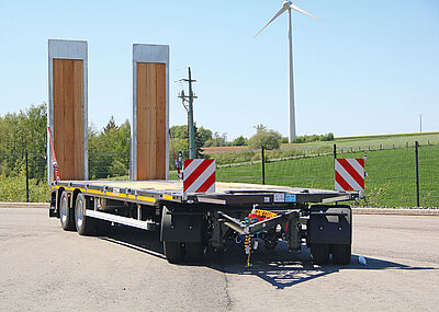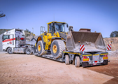 Die tiefen Radmulden ermöglichen den höhenoptimierten Transport von Radladern und Dumpern. Die vordere Radmulde ist durch den Auszug variabel anpassbar. Einlegeelemente dienen dazu, die entstandene Mulde an die zu ladende Maschine und deren Radstand auszufüllen. Die gewichtsoptimierte Bauweise des Satteltiefladers verschafft dem Anwender für seine Aufgaben einen beträchtlichen Nutzlastgewinn.