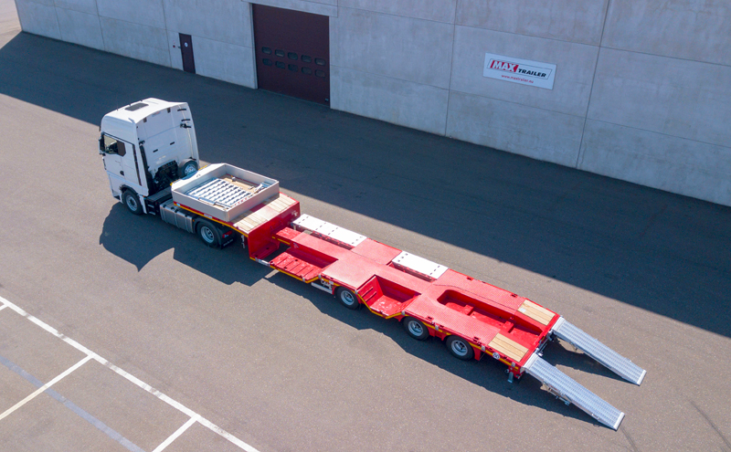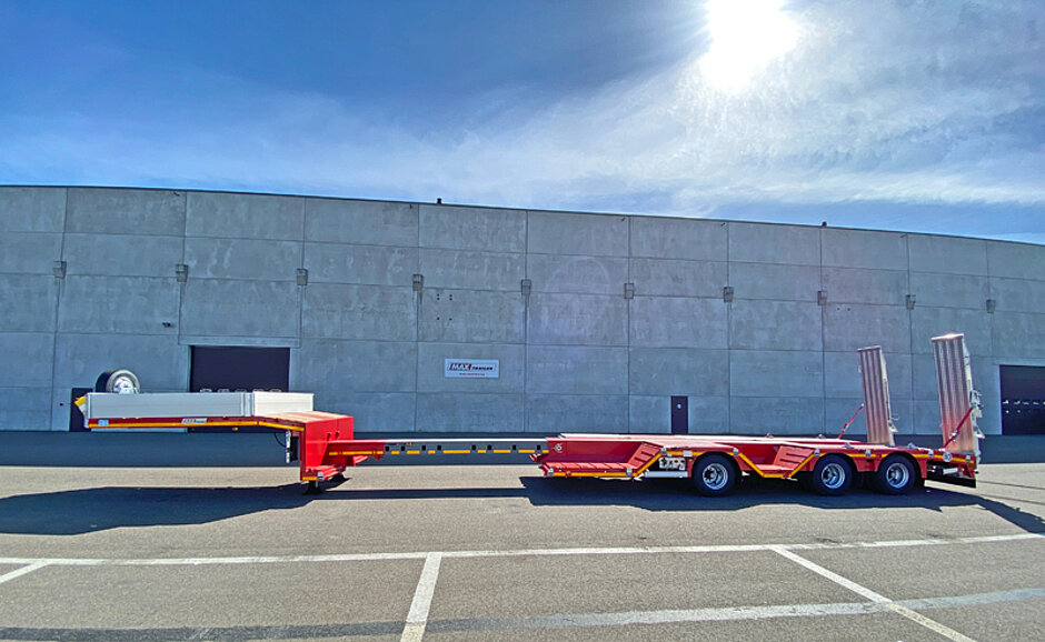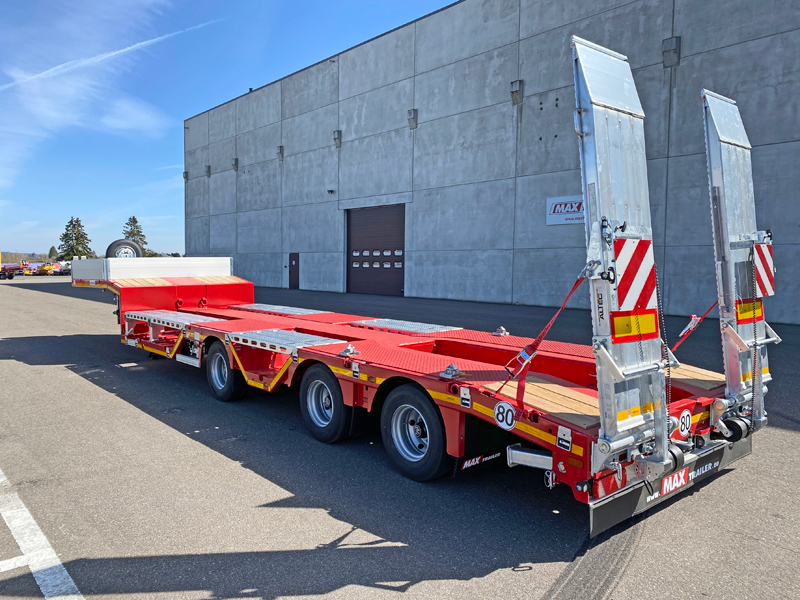Der modulare Baukasten bei MAX Trailer wird weiter ausgebaut. Den MAX100 Semi-Tieflader mit Nachlauf-Lenkachse gibt es nun auch mit zwei Paar Radmulden und teleskopierbarer Ladefläche.