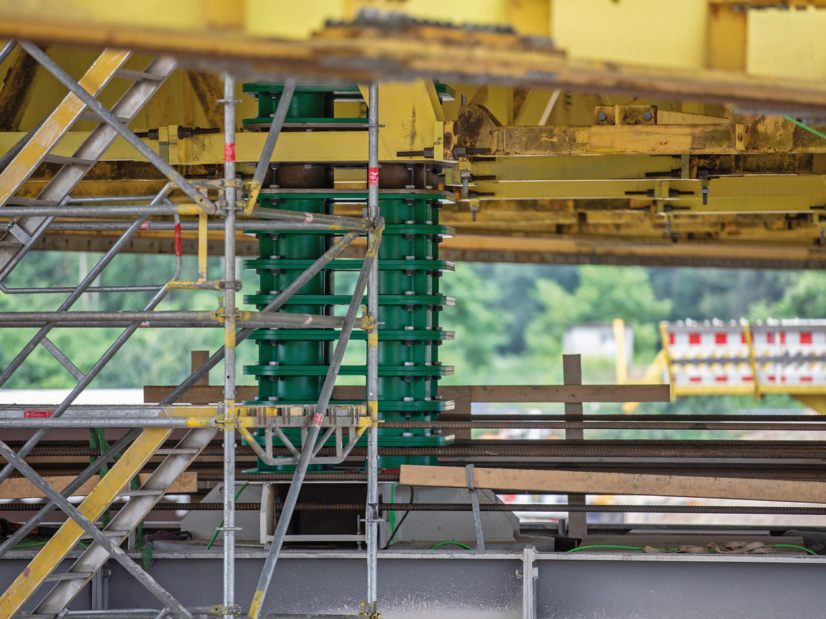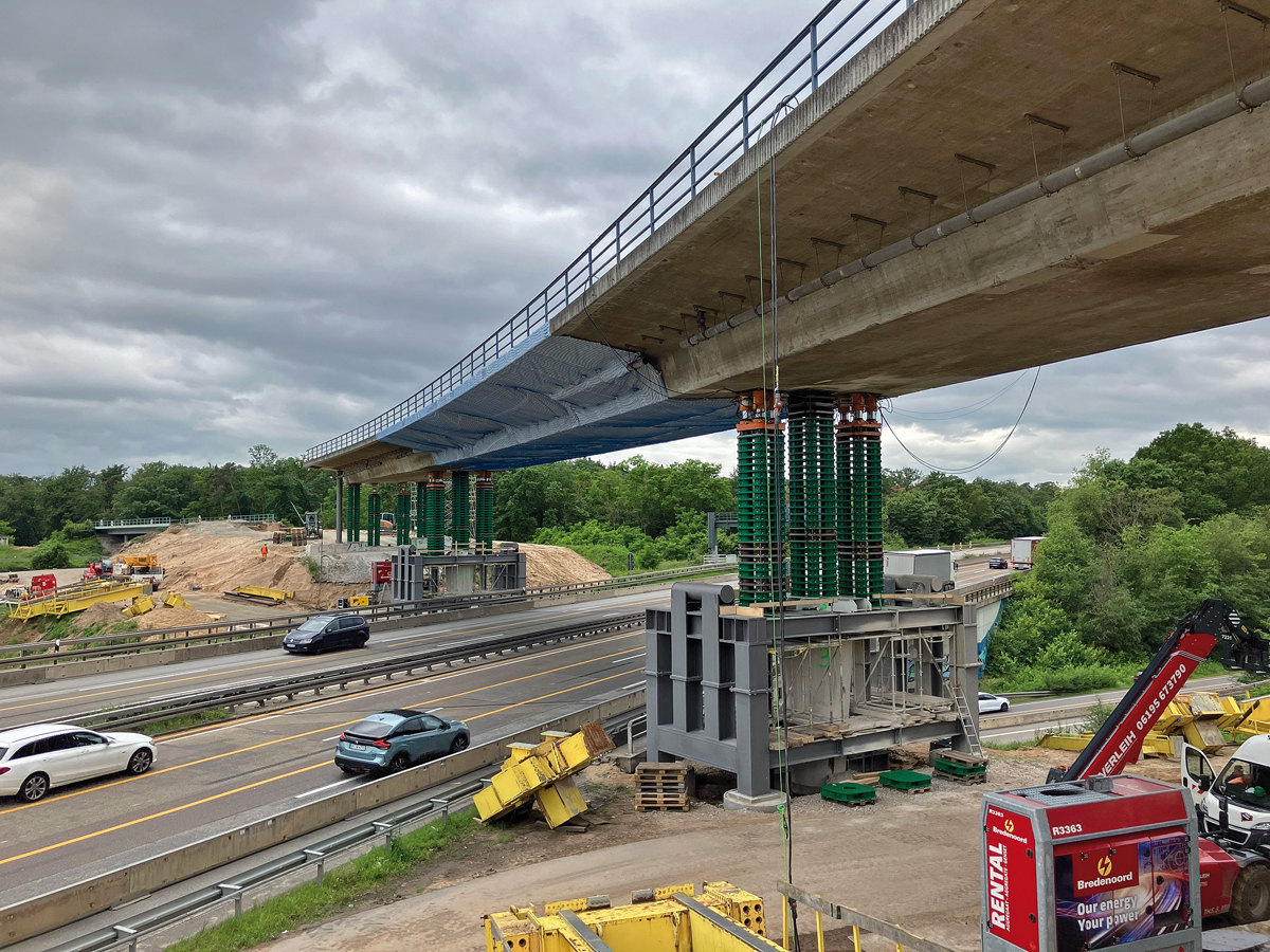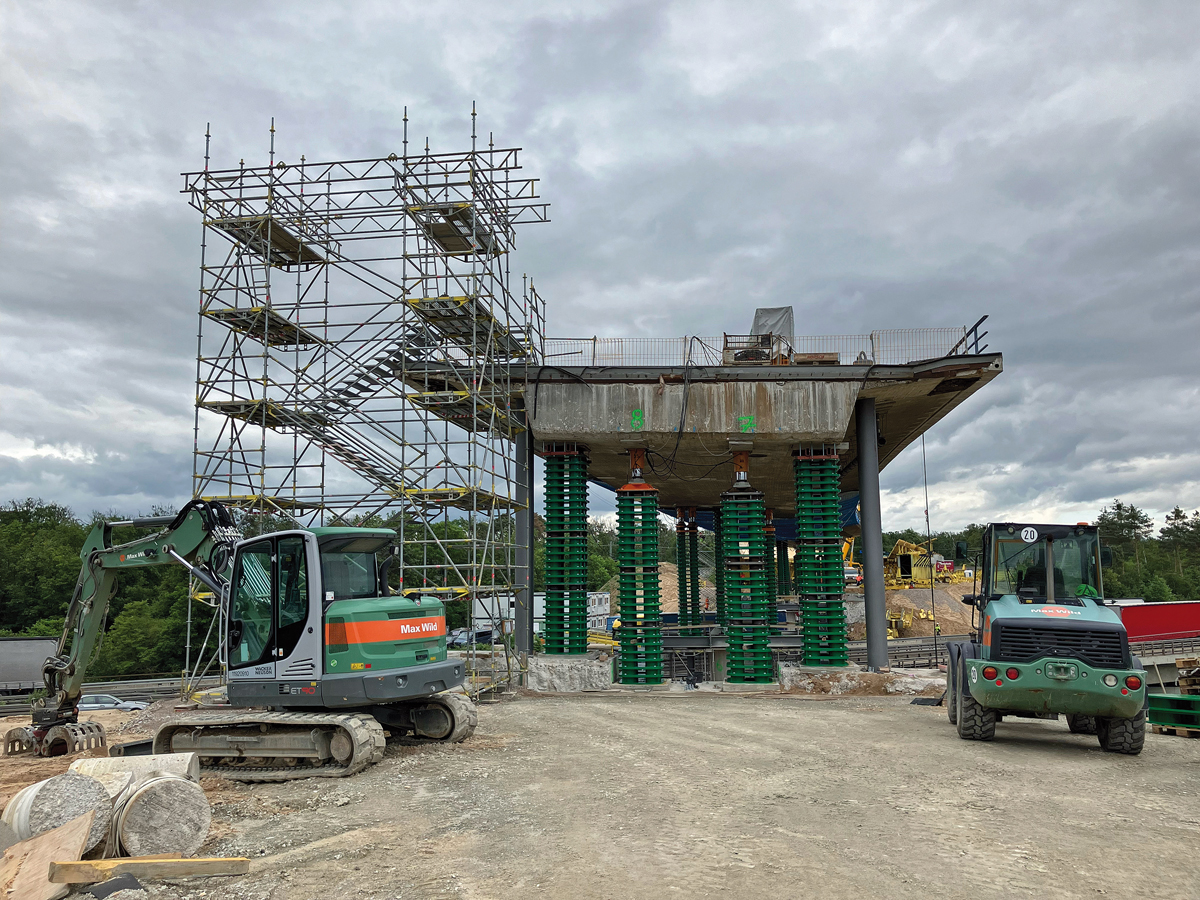 Bevor das Traggerüst eingeschoben werden konnte, musste der 104 m lange und etwa 3 200 t schwere Brückenüberbau erst einmal gut 5,20 m in die Höhe klettern. Mit insgesamt 20 Hydraulikpressen haben die Spezialisten von Max Wild den Brückenüberbau Stück für Stück nach oben »gestapelt«. Die Hydraulikpressen wurden dabei über eine eigens entwickelte Synchronhubanlage gesteuert. Aufgrund der hohen Anforderungen durfte beim Hubvorgang die Abweichung der Pressen zueinander maximal 3 mm betragen. Der Stapelvorgang hat zweieinhalb Arbeitstage gedauert, bis das Traggerüst die Endhöhe von 5,2 m erreichte. Anschließend wurde die bereits hinter dem Widerlager vormontierte Vorschubrüstung längs eingeschoben und mittels Querverschub geschlossen. Das Traggerüst bietet während der Abbrucharbeiten des Brückenüberbaus Schutz für die darunterliegende Autobahn. Aktuell haben die Experten von Max Wild bereits den Belag des Traggerüsts fertiggestellt und eine Behelfsbrücke mit einer rund 60 m langen Rampe als Zufahrt auf den Bestandsüberbau errichtet.