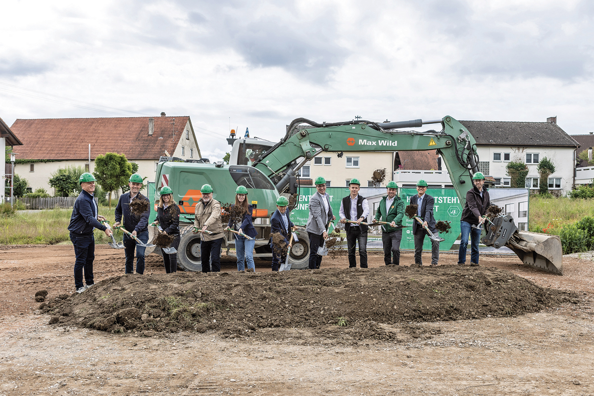 Mit einem symbolischen Spatenstich haben Mitte Juni die Bauarbeiten zum Neubauprojekt »Am Kreuzberg I« in Dettingen an der Iller begonnen. Die Wild Projektentwicklung, Tochter der Firmengruppe Max Wild, erstellt mitten im Ortskern rund 70 neue Wohneinheiten, darunter Einfamilienhäuser, Reihenhäuser und Eigentumswohnungen. Die Fertigstellung der Erschließungsarbeiten ist für Ende 2024 geplant. Durch das neue Baugebiet profitiert die heimische Wirtschaft von einem Auftragsvolumen von rund 22 Mio. Euro.