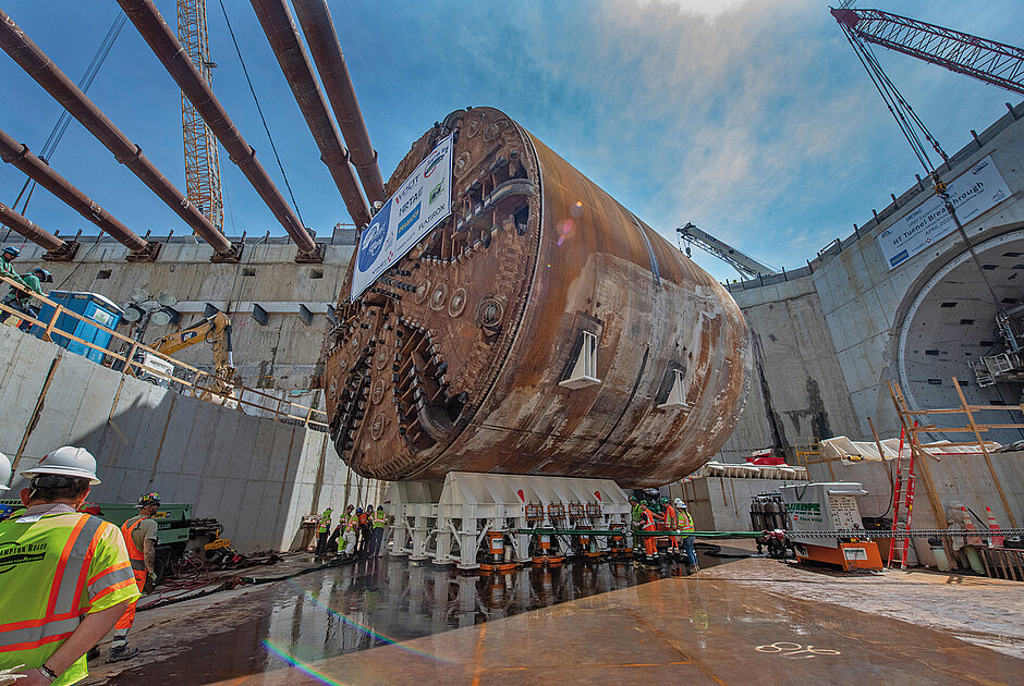 Für die neuen Zwillingstunnel bohrte sich die Tunnelbohrmaschine (TBM) der Herrenknecht AG zuerst von Süd nach Nord, also von Norfolk nach Hampton. Dort angekommen, musste der vordere Teil der TBM, die Schildmaschine, um 180° gedreht werden, um anschließend auf dem Rückweg in entgegengesetzter Richtung den zweiten Tunnel zu bohren. Genau hier kam Max Wild mit seinem Bereich »Heavy Move« ins Spiel. »Mithilfe unseres einzigartigen ›Fluidts‹-Verschubsystems hat Herrenknecht die 14 m Durchmesser große und 2 500 t schwere Schildmaschine gedreht«, erklärt Gerd Chmeliczek, der als Oberbauleiter »Heavy Move« bei Max Wild vor Ort auf der Baustelle in Virginia war.