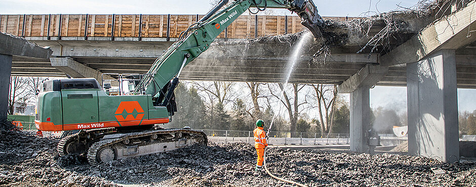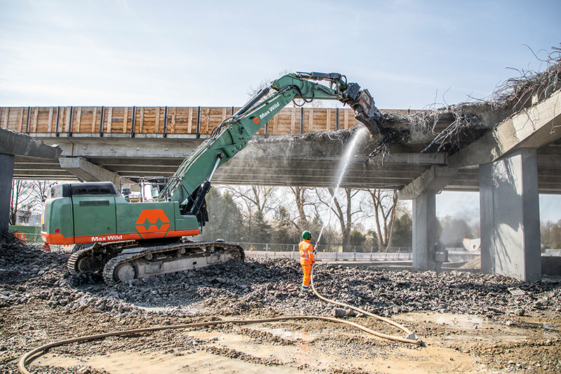Aber auch in den angestammten Geschäftsbereichen – und das sind in erster Linie der Tief- und Erdbau, der Abbruch, die Logistik und die Transporte – hat das Unternehmen vor allem in den zurückliegenden zehn bis 15 Jahren einen großen Sprung nach vorn gemacht. So stieg der Umsatz von etwa 45 Mio. Euro im Jahr 2010 auf rund 120 Mio. Euro im vergangenen Jahr, erhöhte sich die Anzahl der Mitarbeiterinnen und Mitarbeiter von 150 (2005) auf heute insgesamt 650. An der Erfolgsgeschichte hat auch die Corona-Pandemie bislang nichts geändert. »Für uns war 2020 ein gutes Jahr«, sagt Roland Wild. »Wir haben die Corona-Krise ganz gut gemeistert.« So sei Max Wild im Bereich Abbruch einer der »Big Player« in Süddeutschland, ergänzt Daniel Wild. »Im Brückenabbruch gehören wir deutschlandweit sogar zu den ›Top 5‹.«