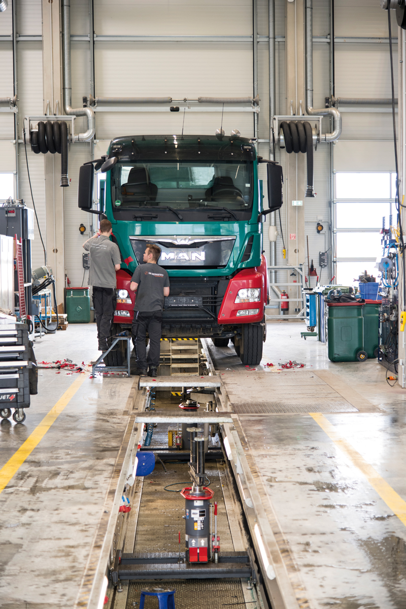 »Wir sind eine Mehrmarkenwerkstatt«, betont Fachgebietsleiter Florian Veit, in der mit »modernsten Werkzeugen und neuesten Analysetools« der Technologiepartner – wie Bosch, ZF, Alltrucks oder Knorr-Bremse – gearbeitet werde. »Unsere Werkstattspezialisten verfügen über enormes Know-how und bieten einen exzellenten Service, egal ob für interne oder externe ›Kunden‹.« Zudem biete der Zwei-Schicht-Betrieb von 7 bis 24 Uhr und eine Reparaturannahme bis 18.30 Uhr eine »große terminliche Flexibilität«.