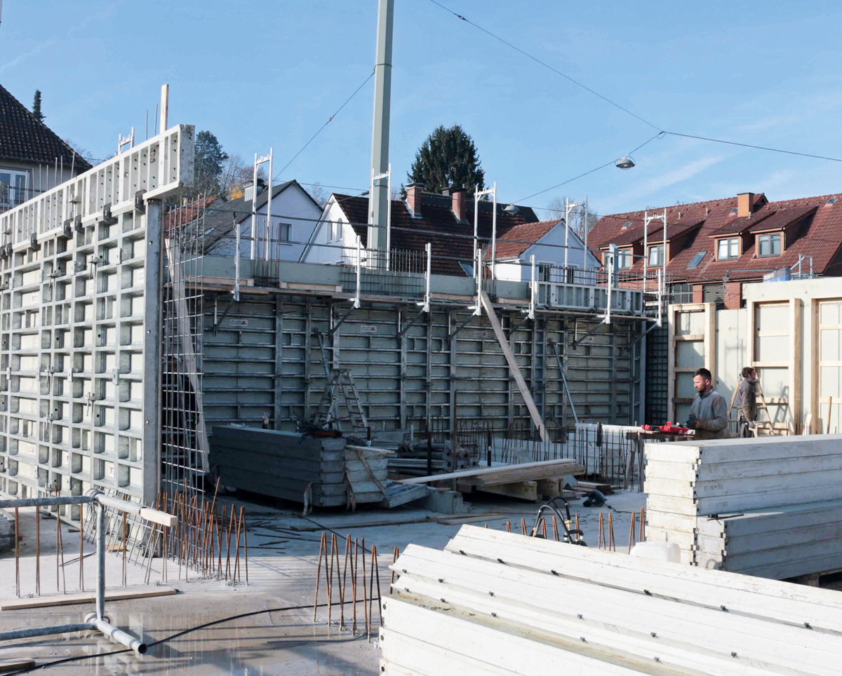 Auf die Bielefelder Baustelle hat Bauleiter Fabian Fromme rund 400 m² UltraMax S und LS gebracht: Die Höhe der 24 cm und 30 cm starken Wände liegt zwischen 2,46 m und 3,2 m, etwa dreiviertel davon aber unter 3 m. Dafür wären die 3 m hohen UltraMax-Elemente optimal geeignet. An den Stellen, an denen es bis auf 3,2 m hinauf gehe, werde einfach mit liegenden 50 cm der UltraMax LS aufgestockt.