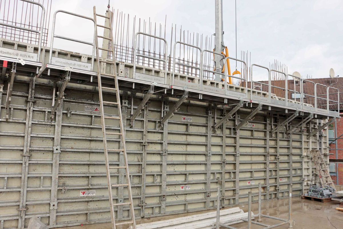 Seit rund 20 Jahren gehören die leichten Aluträger MiniMax für die Filigrandeckenunterstützung zum Gerätebestand von Hauphoff, die nun auch in Bielefeld zum Einsatz kommen. Die Wände werden mit der Rahmenschalung UltraMax S und LS betoniert, die Hauphoff vor ca. drei Jahren gegen ein Wettbewerbsfabrikat eingetauscht hat. Seine wichtigsten Argumente für den Umstieg auf die modulare Schalungsfamilie von Mayer waren deren einheitliche Verbindungsteile: Diese passen ebenso an die leichte Handschalung AluMax, wie an die Alurahmenschalungen UltraMax L und LS – selbst die Stahlrahmen der schweren UltraMax S-Elemente werden damit verbunden. Ein Kaufaspekt war ebenso das Meterraster der Elemente, erleichtern doch die Formate die Schalungsplanung erheblich.