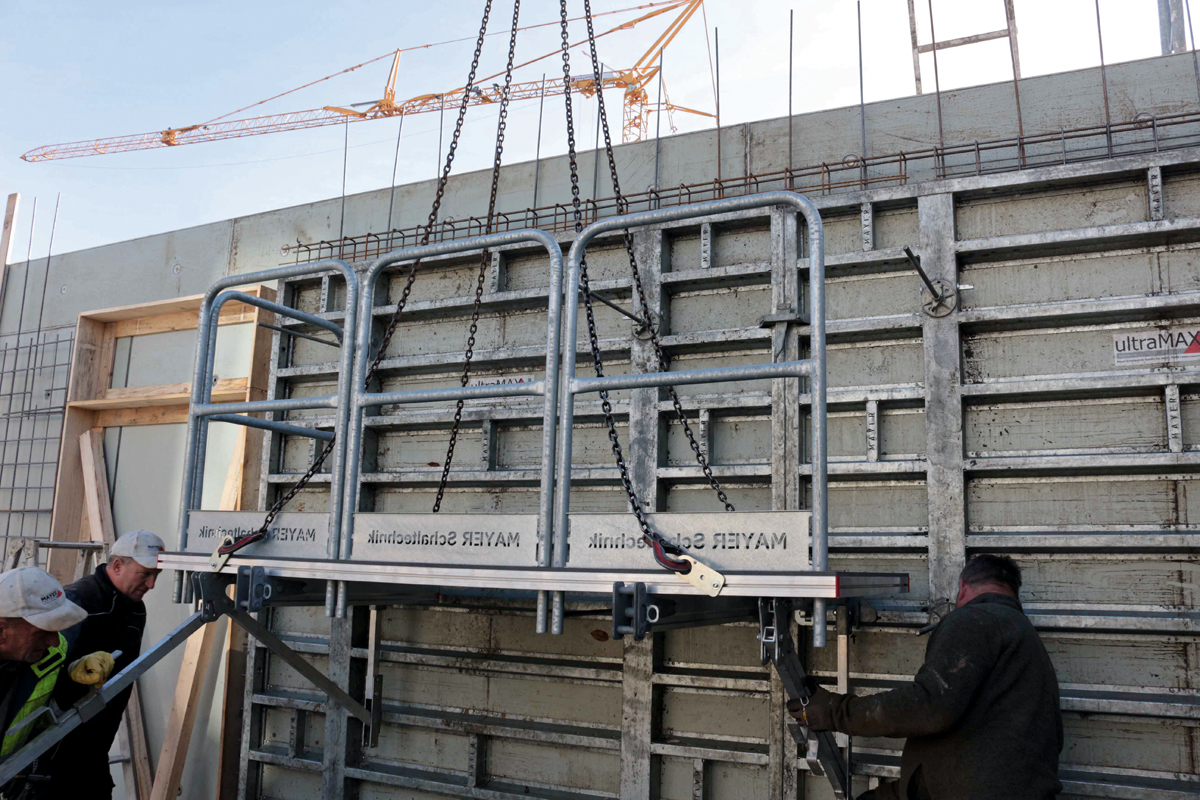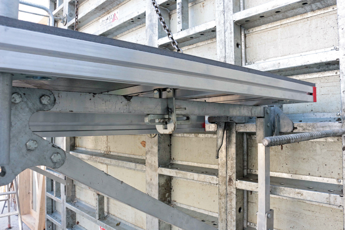 Bei den feuerverzinkten Stahlrahmen der UltraMax S sowie bei der leichten UltraMax LS mit den pulverbeschichteten Aluminiumrahmen sind die Abmessungen der Hohlkammerprofile gleich. Deshalb stellt deren gemischte Verwendung und Verbindung mit dem MST-Schalschloss kein Problem dar. Gleich sind auch die Querstreben zur Montage unterschiedlichster Zubehörteile wie Riegelspanner, Gerüstkonsolen, Richtschienen oder Betonierbühnen. Mit drei Elementbreiten zwischen 1 m und 2,5 m bei 3 m Höhe bietet sich die schwere S-Version für die »Fläche« an, die leichten Alu-Elemente der LS-Ausführung kommen beim Längenausgleich, zum Aufstocken und dort, wo von Hand ohne Kranunterstützung geschalt werden muss, zum Zug.