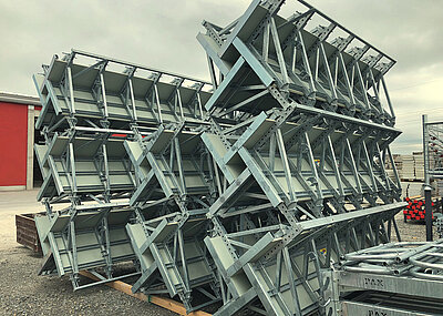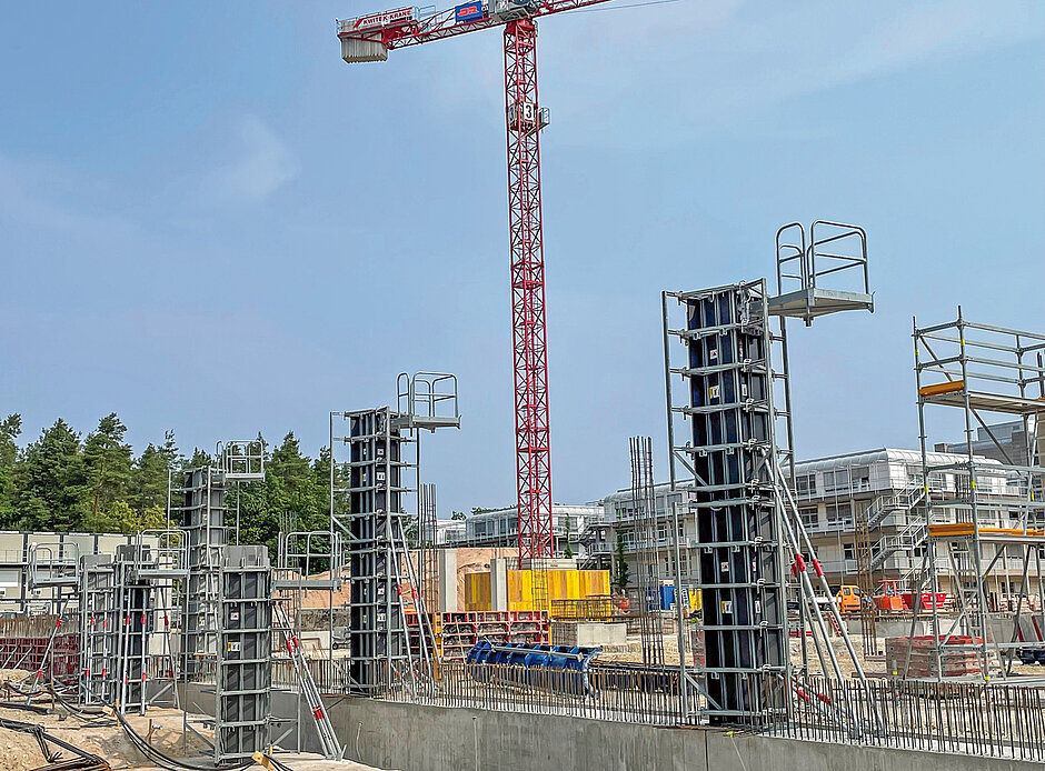 Zunächst wurden fünf Vorhaltungen (Höhe 320 cm plus 70 cm) angemietet. Der schnelle Aufbau sowie das anschließende unkomplizierte Umsetzen hatte zur Folge, dass im weiteren Bauablauf zusätzliche zehn Vorhaltungen (Höhe 270 cm) plus Aufstockung hinzukamen. So entstanden zügig ca. 40 Stützen mit einer Höhe von 3,80 m pro Etage. Weitere 74 Stützen pro Etage mit einer Höhe von 2,90 m kamen ab dem Erdgeschoss bis in die Obergeschosse dazu. Nebst dem einfachen Aufbaumechanismus hinterließ die Stützenschalung auch dank hoher Frischbetondruckaufnahme und daraus resultierender Stabilität über die gesamte Bauzeit von zwei Jahren einen bleibenden Eindruck. Das führte dazu, dass sich Rädlinger gleich für den Kauf des kompletten Equipments entschied.