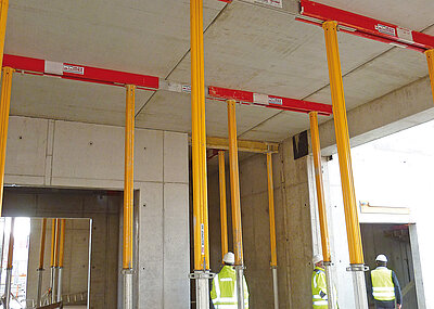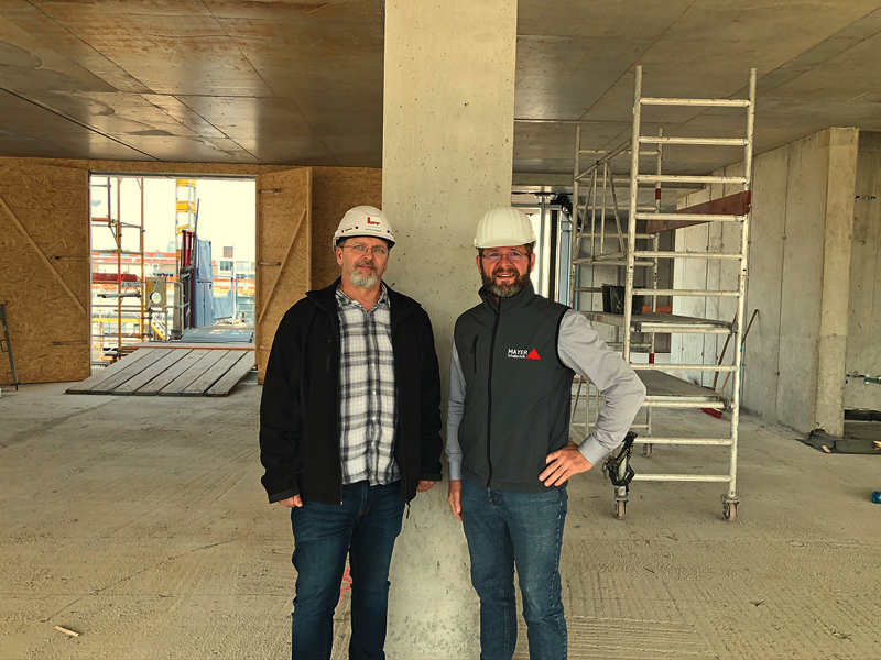 Eine »tragende« Rolle spielen rund 390 senkrechte Stahlbetonstützen. Mit Kantenlängen zwischen 30 cm und 55 cm und 3,3 m bis 3,8 m Höhe tragen sie die sechs Geschossdecken des Bürozentrums. Diese wurden von den Architekten nicht mit gebrochenen Kanten, sondern scharfkantig gefordert – allerdings »nur« in Sichtbetongüte SB 2 bzw. SB 3. Bei Adolf Lupp hat man »eine Schippe draufgelegt« und die höchste Oberflächenqualität angestrebt, wie der verantwortliche Lupp-Oberbauleiter Nils Witschonke erklärt. »Quasi als Sicherheitsreserve, damit die geforderte Qualität über die gesamte Baustelle auch gewiss nicht unterschritten wird.« Auf die entsprechende Frage von Christian Grübel, Arbeitsvorbereiter bei Lupp, an seinen Schalungspartner Mayer Schaltechnik in Bergrheinfeld »kann eure PAX-HD-Stützenschalung auch scharfkantig in SB 4?«, kam von Mayer-Außendienstmann Walter Siegler ein überzeugtes »Yes, we can«.