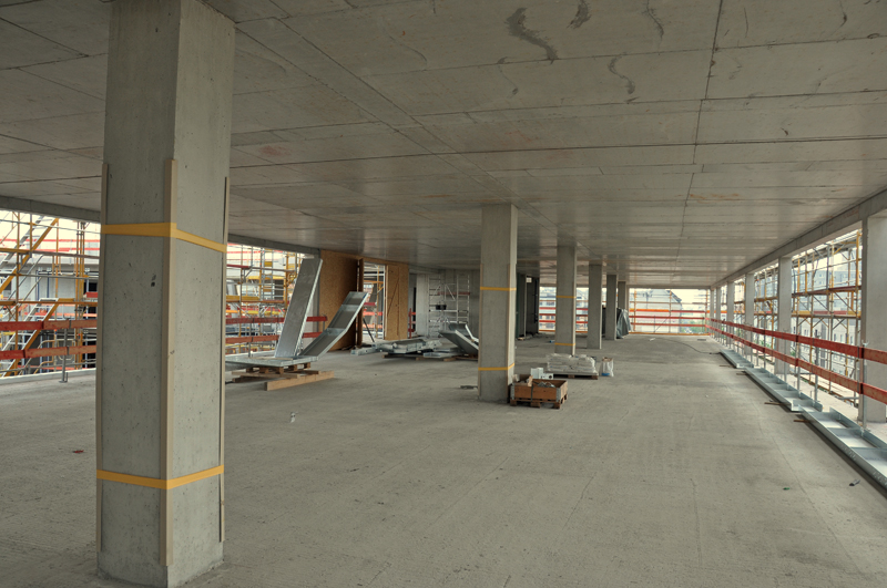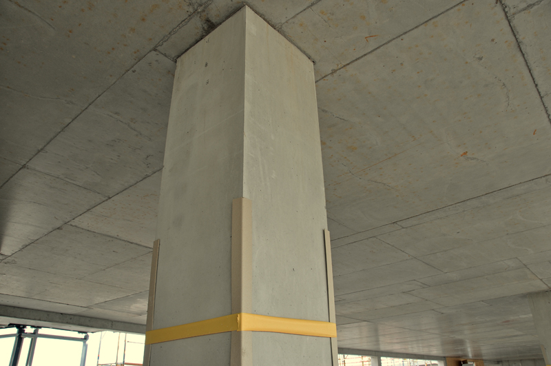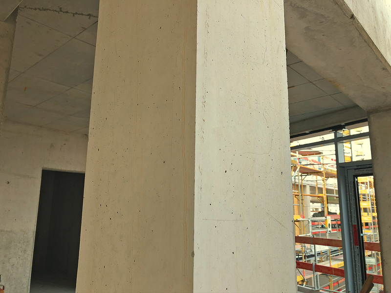 Die Ergebnisse überzeugen: makellose Sichtbetonoberflächen mit einer glatten, nahezu porenfreien und gleichmäßig gefärbten Betonoberfläche, mit sauberen, scharfen Kanten ohne nennenswerte Ausblutungen. Das setzt allerdings höchste Sorgfalt voraus – beim Einschalen und beim Betonieren – ganz besonders aber beim Ausschalen. Damit der positive Eindruck zumindest bis zur Abnahme erhalten bleibt, wurden alle Ecken der fertigen Stützen mit Eckschutzprofilen gesichert.