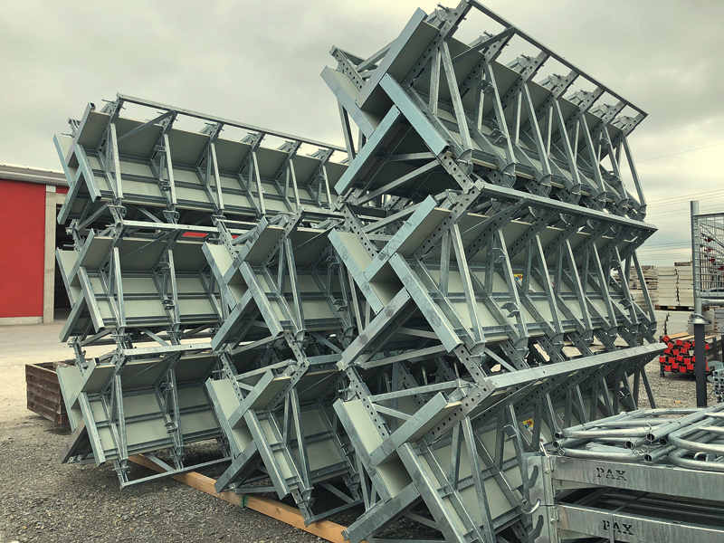 Mit den Varianten PAX HD 60 und PAX HD 120 lassen sich im 5-cm-Raster quadratische oder rechteckige Stützenquerschnitte zwischen 20 cm und 120 cm Kantenlänge einstellen – ohne Schalhautwechsel oder -verschnitt. Die PAX HD 60 deckt Querschnitte von 20 cm x 20 cm bis 60 cm x 60 cm ab, die PAX HD 120 bis 1,2 m Kantenlänge. Beide können kombiniert werden. Neben den Höhen 320 cm bzw. 270 cm gibt es 120 cm und 70 cm hohe Aufstockelemente und 40 cm hohe Aufstockwinkel. Damit sind variable, stufenlose Betonierhöhen bis über 9 m möglich. Dabei bietet die PAX HD einen zulässigen Frischbetondruck von bis zu 120 kN/m², sodass es beim Betonieren praktisch kein »Tempolimit« geben sollte. Die vier im Windmühlenflügelprinzip angeordneten Stahlrahmen werden zum Ein- bzw. Ausschalen zu- bzw. aufgeklappt und mit Bolzen gesichert. Dank verbesserter Verschlusstechnik per Bedienzwinge und unverlierbarem Doppelbolzen sind die Flügel ohne Hammer zu schließen und zu öffnen. Die PAX HD wird als komplette Einheit mit einem Kranhub versetzt oder auf Rollen zum nächsten Einsatz geschoben. Anbauteile wie Betonierbühne, Leiteraufstiege oder Richtstreben verbleiben an der Schalung. So ist das erneute Einschalen nur noch eine Sache von Minuten. Die Schalhaut ist fest von hinten auf den Rahmen verschraubt, das hinterlässt auf der sichtbaren Betonfläche keine Abdrücke von Schrauben, Nieten oder Nägeln. Üblicherweise werden in den Ecken Dreikantleisten montiert, muss man scharfkantige Säulen wie in Berlin abliefern, geht es auch ohne.