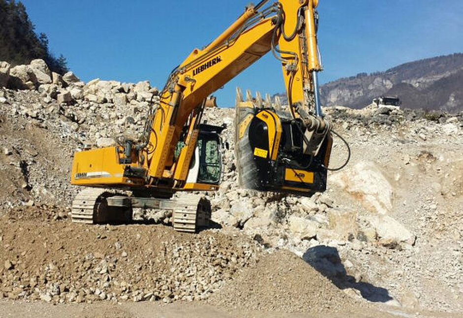 Gleich am Eingang des Steinexpo-Steinbruchs begrüßt in diesem Jahr der nach Anbieterangaben größte Backenbrecherlöffel der Welt die Besucher. Der BF150.10 von MB Crusher wartet mit einer Ladekapazität von 2,3 m3 sowie einem Gewicht von rund 10 t auf und wurde für Einsätze beispielsweise im Bergbausektor und auf sehr großen Baustellen konstruiert. Der Backenbrecherlöffel profiliert sich als kaum entbehrliche Maschine für Vorabzerkleinerungen von Gewinnungsresten in Steinbrüchen, die anschließend im Verkehrswegebau Verwendung finden.