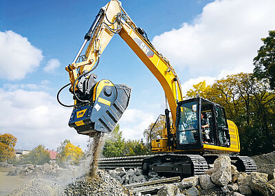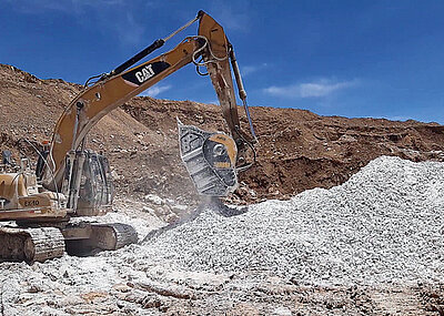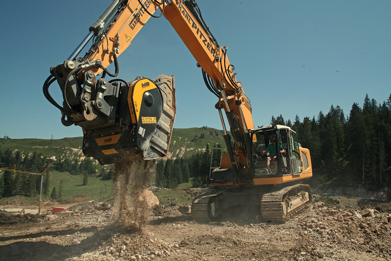 In Österreich folgte Schritt für Schritt ein BF120.4-Backenbrecherlöffel dem Verlauf von im Bau befindlichen Skipisten. Lokaler Kalkstein musste zerkleinert werden, um ihn gleich anschließend als Untergrund für eine Skipiste als »Winterstraße« wieder einzubauen.