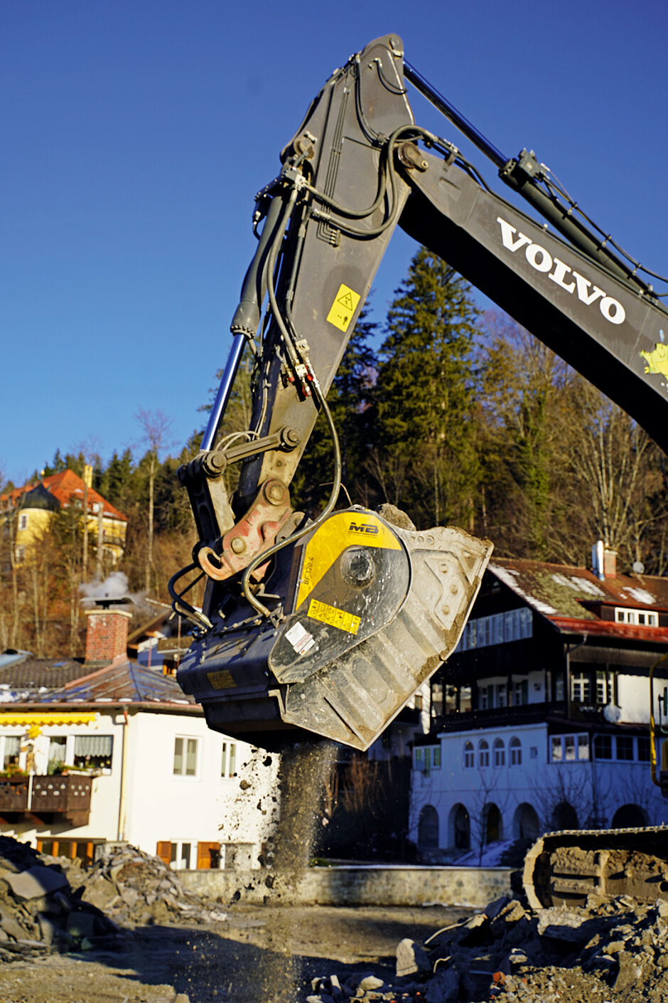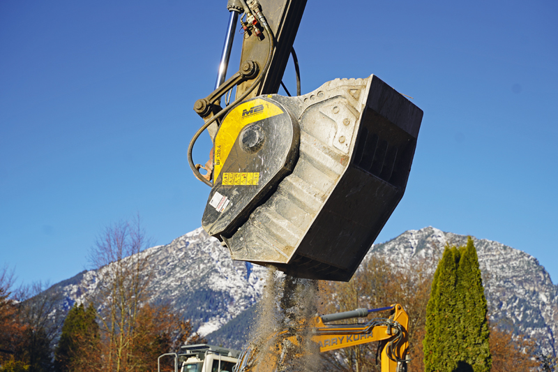 Auch die Firma Erwin Mayr jun. aus Wallgau (Bayern), bekannt ebenso als »Steinbeißer24«, hat Baggerbetrieb und Mietpark mit einem MB-Brecherlöffel BF120.4 ausgerüstet. Die Firmenleitung war auf der Suche nach einer Lösung für kleine und beengte Baustellen, auf denen der Einsatz einer raupenmobilen Brechanlage aufgrund der geringen Platzverhältnisse oder der Genehmigungen unmöglich ist.