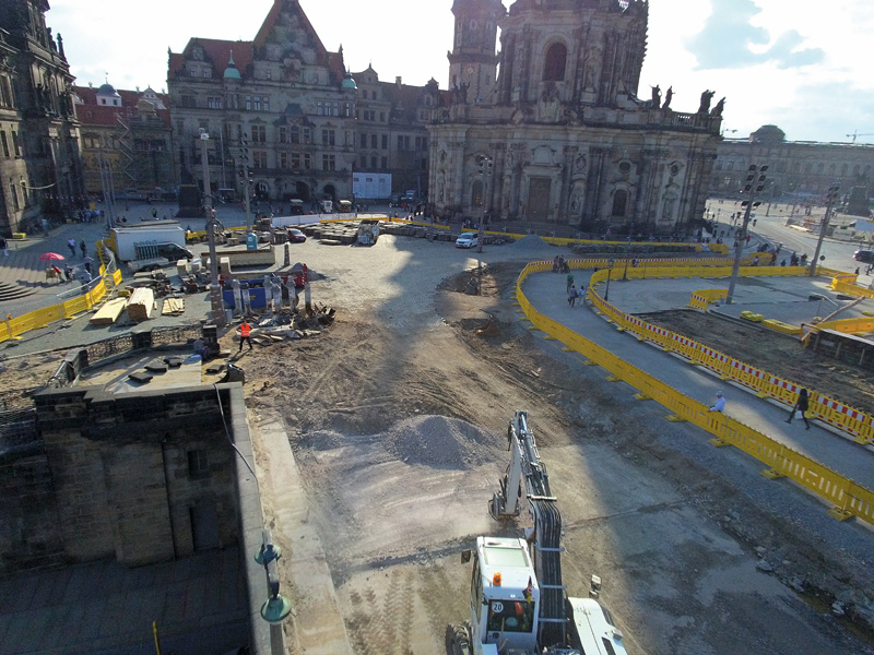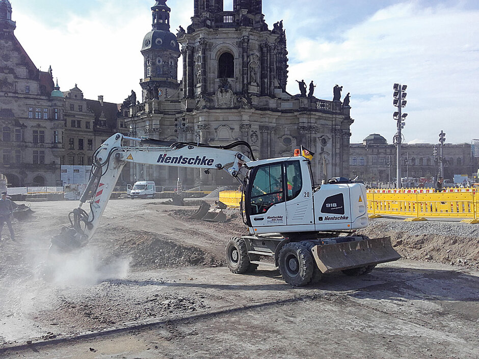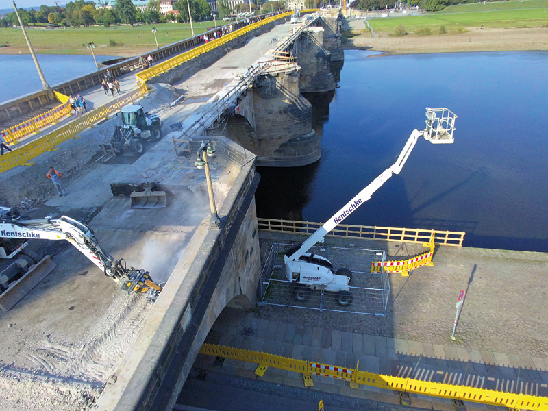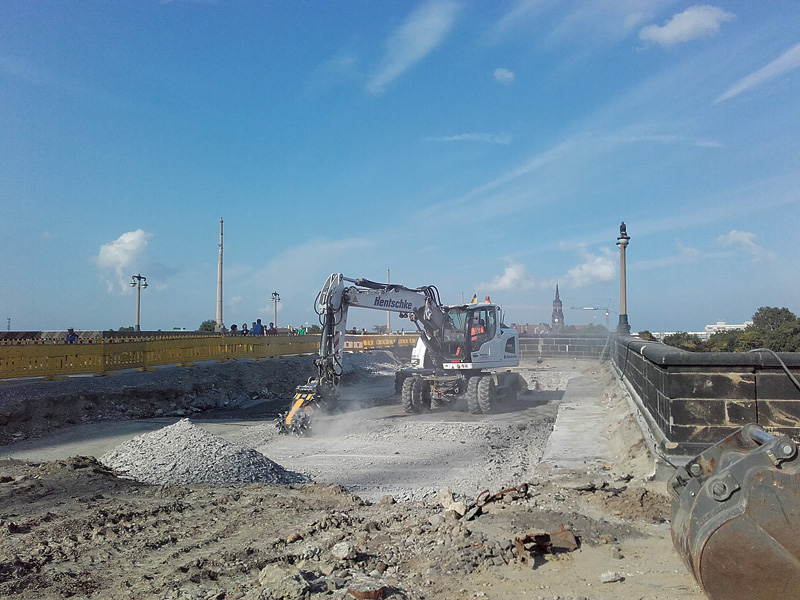 Die Fräsarbeiten wurden in zwei Phasen durchgeführt. Zuerst wurde mit der MB-Fräse an den diagonal verlaufenden Fugen der Brücke gearbeitet, um die Dehnungsfugen zu lösen. Dies war eine der heikelsten Phasen, da bei dem Vorgang die Struktur nicht beschädigt werden durfte. Anschließend kam die MB-R800 zum Einsatz, um Teile des Zements zu entfernen, der die Brückenbögen füllte, wobei auch bis zu 3 m tief gegraben wurde. Nach Abschluss der Fräsarbeiten wird die Arkade mit neuem Zement gefüllt und der begehbare Teil mit Steinen gepflastert werden, die früher die alte Struktur bildeten. Die MB-R-Palette besteht aus drei Modellen: das kleinste Modell MB-R700 arbeitet mit Baggern von 6 t bis 13 t, das in Dresden eingesetzte und 1 t auf die Waage bringende Modell MB-R800 ist für Bagger von 10 t bis 22 t geeignet, das größte Modell MB-R900 bietet sich für Bagger von 19 t bis 35 t an.