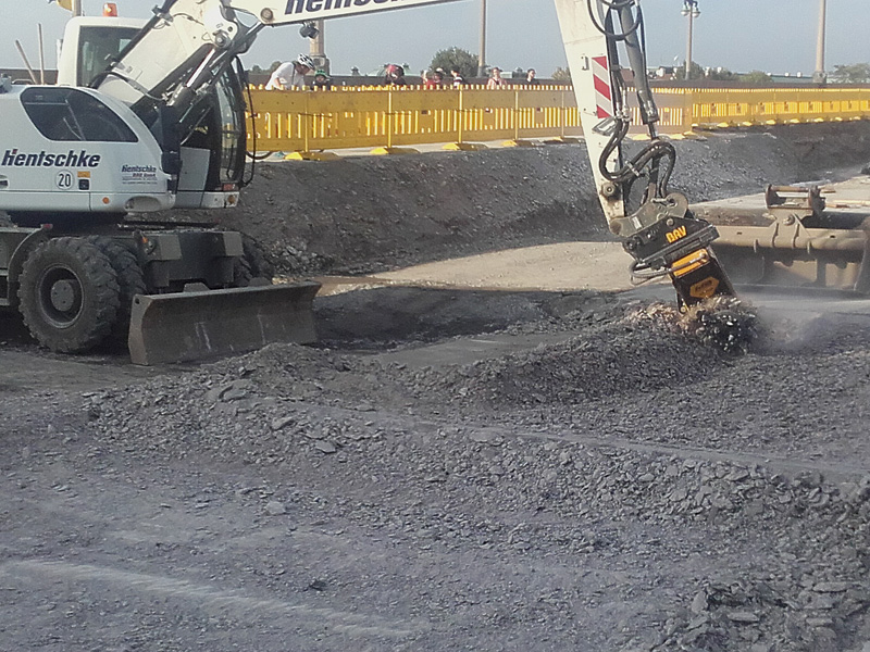 Eine Anbaufräse des Typs MB-R800 für Bagger von 10 t bis 22 t hat einige Monate auf der Baustelle der Augustusbrücke gearbeitet – montiert an einem Liebherr-Baggermodell 918.