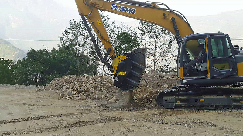 Oft ist es bei einem Straßenbauprojekt nicht gerade praktisch, Zuschlagstoffe für den Unterbau zu kaufen und diese erst per Lkw zur Baustelle zu transportieren. Ein indisches Bauunternehmen greift hingegen auf einen MB-Backenbrecherlöffel BF90.3 zurück, um vor Ort anfallendes Material unmittelbar auf die richtige Größe zu reduzieren und es gleich wieder zu verbauen.