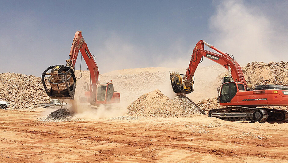 In Saudi-Arabien verarbeiteten ein MB-Brecherlöffel BF135.8 (für Bagger mit Betriebsgewichten von mehr als 47 t) und ein Sieblöffel MB-S18 (für Bagger mit Betriebsgewichten zwischen 20 t und 35 t) Material, das anschließend für den U-Bahn-Bau in Riad wiederverwendet wurde. Das ausführende Bauunternehmen extrahierte mit der MB-Technik das Material, siebte und zerkleinerte es, um es anschließend einer neuen Verwendung zuzuführen.
