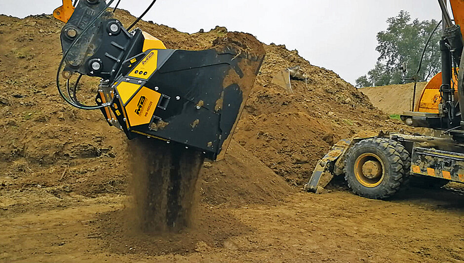 Seine Fähigkeiten hat der HDS-Separator beispielsweise in Polen in der Flussuferverstärkung beim Separieren nasser Erde an einem JCB JS175 unter Beweis gestellt. Dem klebrigen und zur Verdichtung neigenden Aushub konnte man dort dank RQ50-Wellen-Kit am MB-Schaufelseparator HDS320 deutlich Herr werden.