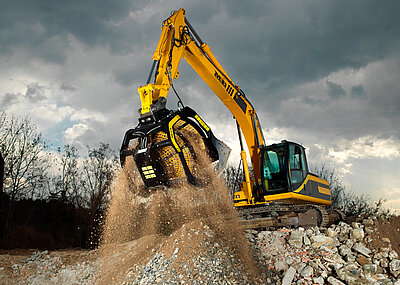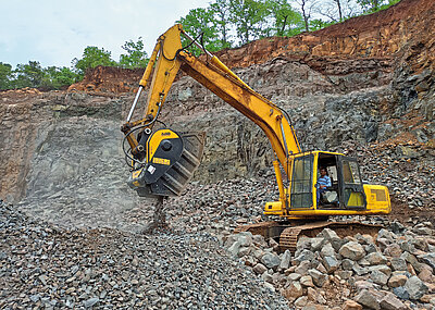 Des weiteren werden von der Firma auch viele Abrisse gemacht, bei denen natürlich auch Bauschutt anfällt, der direkt weiterverarbeitet und wiederverwertet werden kann. Und aus alten Pflastersteinen, die je nach Anforderung auf 0 mm bis 35 mm mit dem Brecherlöffel gebrochen werden können, entsteht Material, welches sich weiterverkaufen lässt. Mit dem so gebrochenen »Abfallmaterial« kann also auch noch Gewinn erwirtschaftet werden. In diesem Beispiel konnte das Unternehmen sich die Transporte zu einer 30 km entfernten Deponie sparen. Und außerdem wurden auch noch Personal und Fahrzeuge eingespart, da bereits das Trägergerät sowie der Bedienende auf der Baustelle vorhanden sind. Einfach den Brecherlöffel an das Trägergerät anhängen und das Material aufbereiten ohne zusätzliche Trägergeräte oder Mitarbeiter.d
