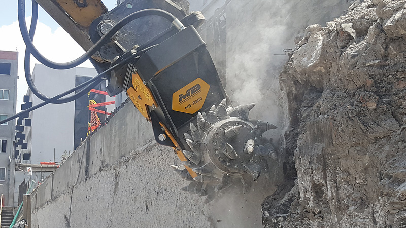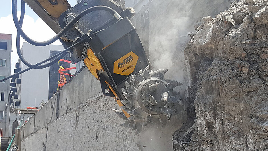 Nach dem Teilabbruch der alten Fabrik wurde die Baugrube für das künftige Einkaufszentrum ausgehoben und entsprechende Schlitzwände errichtet, um ein Nachrutschen des umgebenden Bodens in die Baugrube zu verhindern. Nach dem Errichten der Schlitzwände standen die Mitarbeiter des ausführenden Unternehmens Pilotec vor einem Problem: Beim Bau der Mauern auch freigelegter Felsboden musste noch abgeschliffen werden – eine Aufgabe für die MB-Fräse MB-R800.
