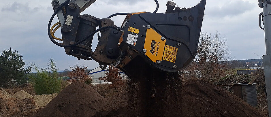 Bei Aushubarbeiten wird die Erde oft mit Ästen, Steinen, Wurzeln und anderen „störenden“ Materialien vermischt. Warum alles auf eine Deponie schicken, wenn man mit dem Schaufelseparator MB-HDS die Störstoffe einfach und schnell von der Erde trennen und die Erde dann wieder verwenden kann? Eine Baustelle in Deutschland hatte genau dieses Problem: Die nächstgelegene Deponie, zu der das abgetragene Erdreich gebracht werden konnte, war etwa 35 km entfernt, was einen erhöhten Zeit- und Kostenaufwand bedeutete. Das Problem wurde durch den Einsatz eines Schaufelseparators MB-HDS207 gelöst, mit dem das Material gesiebt und die Erde von Steinen und Wurzeln getrennt wurde.