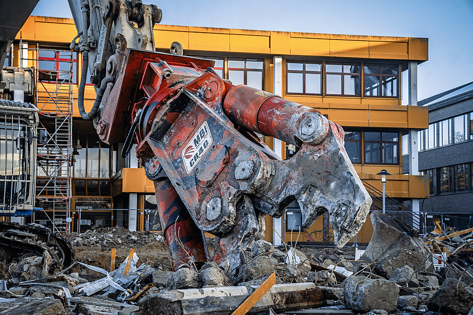 Für diese komplexen Abrissarbeiten in Bremervörde kommt unter anderem eine Abbruchzange der CR- Serie aus dem Hause MBI zum Einsatz. Die CR40RE ist ideal für die Bewältigung von schwierigen Abbrucharbeiten geeignet. Das zentrale Doppelbolzen System gewährleistet eine größere Öffnung, die hydraulische Rotation erleichtert die Positionierung und der doppelte Drehkranz sorgt für die notwendige Stabilität. Mit knapp 4,8 t Eigengewicht ist die CR40RE ein echtes Schwergewicht. Die 122 t Brechkraft an der Spitze und eine Öffnungsweite von ca. 1 400 mm sollen eine zügige Bewältigung der entsprechenden Arbeiten ermöglichen. Das austauschbare Zahnsystem erleichtern zudem die Wartungs- und Reparaturarbeiten.d