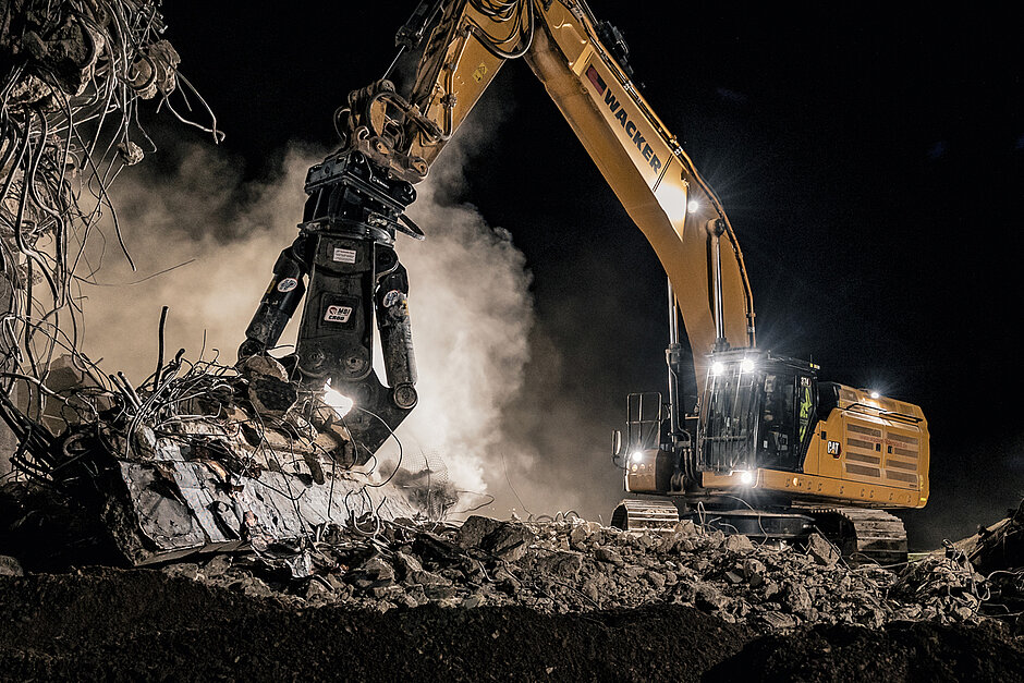 Realisiert wurde der Brückenabbruch mit der Firma Wacker Filderstadt. Das Team um Geschäftsführer Oliver Wacker hat bisher nicht nur auf diesem Autobahnabschnitt Erfahrung beim Abbruch von Brücken sammeln können und ist Spezialist auf diesem Gebiet. Doch bei diesem nächtlichen Abbruch, der mit der Vollsperrung der Autobahn um Punkt 20 Uhr an einem Samstag begann, war nicht alles Routine. Durch die Zeitumstellung auf Sommerzeit fehlte dem Team nicht nur eine Stunde, um den Abbruch durchführen zu können, auch wurde eine neue Abbruchzange seinem ersten Härtetest unterzogen. Wacker schickte die 6,2 t schwere CR60E mit einer Öffnungsweite von 1 580 mm ins Rennen, um den Kampf gegen Stahlbeton und die tickende Uhr gewinnen zu können.