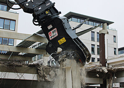 Im Einsatz überzeugten nicht nur die Geschwindigkeit, sondern auch die Kraft der Abbruchzange. Die Schneidkraft beträgt 669 t, die Kraft an der Spitze 174 t. Die Langlebigkeit des Anbaugeräts auf den anspruchsvollen Abbruchbaustellen wird durch die austauschbaren Verschleißteile wie Zähne und Messer gewährleistet. Die Geometrie des Gebisses und die Bauform der Zähne garantieren laut MBI durch das enorme Durchdringvermögen einen effizienten und kraftvollen Einsatz beim Abbruch von Massivbetonbauten. Durch den Einsatz der Abbruchzange konnten die Binder des Überbaus nach Plan in größere Stücke zertrennt und anschließend von der Fahrbahn gebracht werden. Anschließend fand das fachgerechte Recycling des Stahlbetons statt, die Gründungsdisziplin der Firma Wacker.d